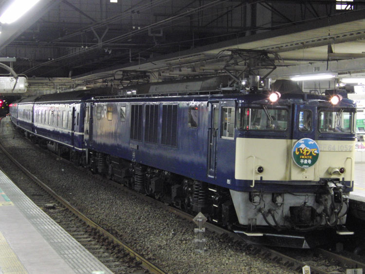 ”あけぼの”を撮ってから、8番線に移動して急行「平泉・いわて物語号」を待機。 まだ30分以上もあり、普通列車は何本も入線してくるのですが、すでに大勢の鉄道ファンが同列車の到着を待っており、大変危険な状態。どんどん増えて行き、入線直前には普通列車の1・2号車から乗客が降りれず、駅員が誘導するほど。そんな中、急行「平泉・いわて物語号」が入線してきました。 ↑回9511レ EF65-1105[田]+24系25形客車6B 急行"平泉・いわて物語号"@大宮 牽引機はPF1118号機と発表されていましたが、D51の返却配給を牽引予定だったEF65−501の故障に伴いゲッパが牽引したため、急遽PF1105号機が牽引することになったようです。つい1時間半ほど前に大宮駅を上っていきましたので、本当に急な変更だったようですね。HMはなし。 ↑9511レ EF65-1105[田]+24系25形客車6B 急行"平泉・いわて物語号"@大宮 側面幕は特製のものを表示。 ↑同上 後ろは、よく写っていませんが「急行」幕でした。 ↑同上(後追い) この後、発車時にはオウムの歌がラジカセで流されるなど、それはもう大混乱でわけが分からない状態になっておりました。 この日はこれにて帰宅。