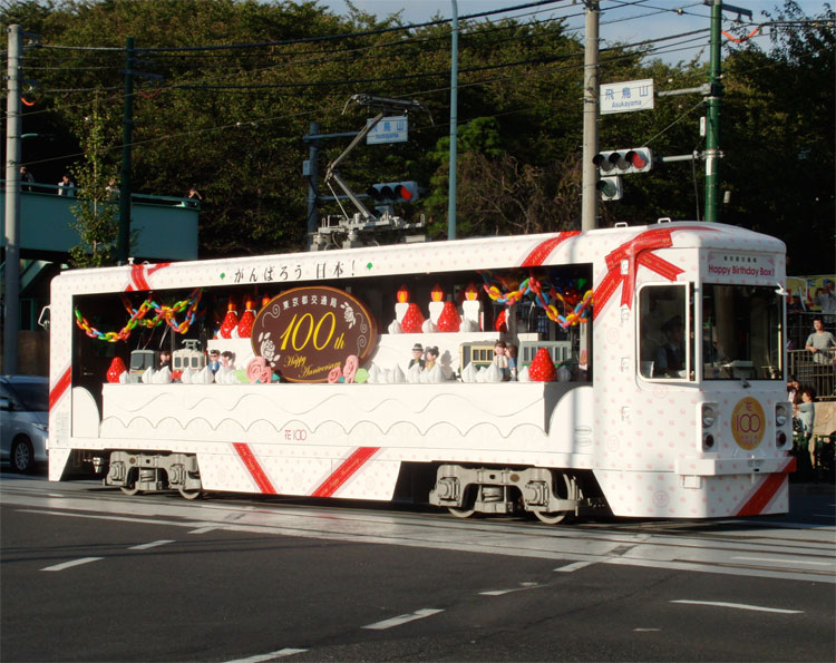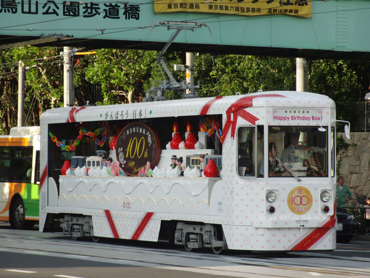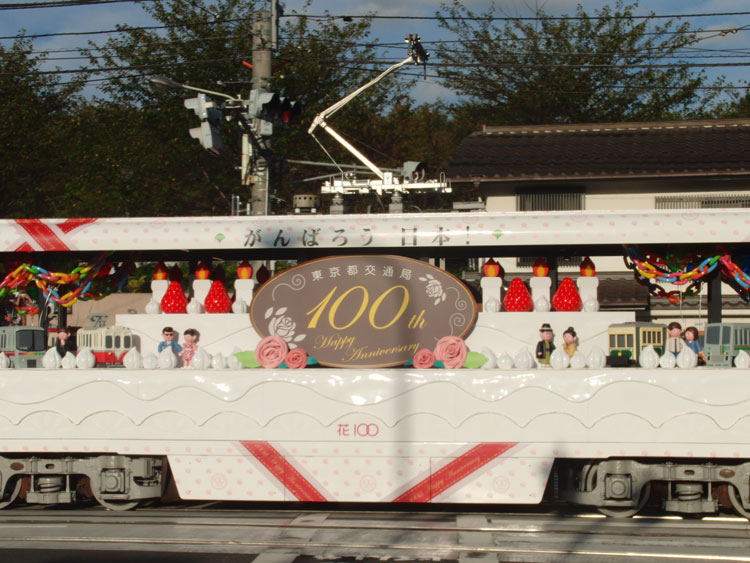 横浜線「華」撮影の合間に、都電荒川線で運転された「花電車」も撮ってきました。 今回の「花電車」は、東京都交通局が100周年を迎えたことを記念して運転されたもので、予定では6月に運転されるはずだったのですが、震災の影響で10月の運転となりました。車両は廃車となった7500形(7510号車)を改造した「花100」。なお、都電での花電車運転は33年振りとなりました。 飛鳥山交差点付近で待機。警備員専用車が登場。 車内は警備員だらけ。まるでフジ系某鬼ごっこ番組のようです・・・(笑) そして本番。 もちろん、側面重視でここを選びました。装飾が細かい・・・。 「花電車」としての運転は10月30日を以て終了してしまいましたが、今後もこの車両を使ったイベントが行われるようですので、ご予定が合わなかった方もぜひこちらに。 せっかくここまで来たので、飛鳥山公園の保存車も見に行ってきました。続きます。 | カレンダー