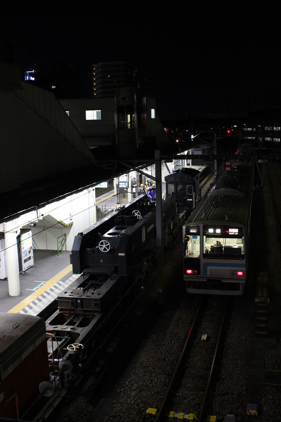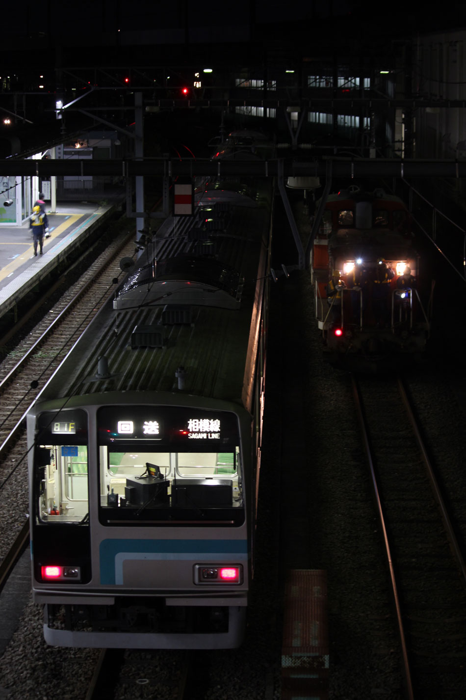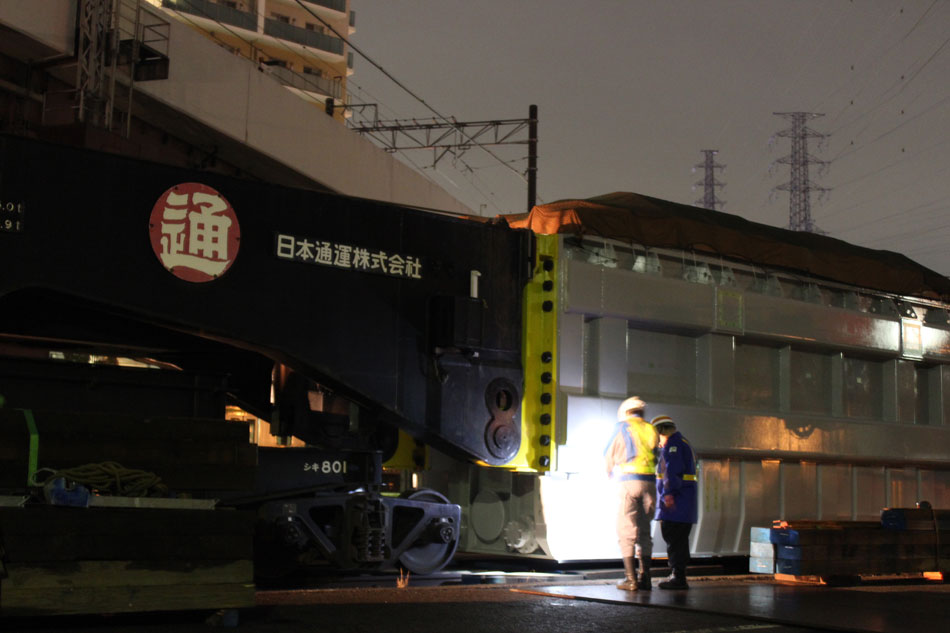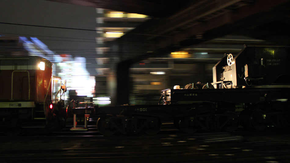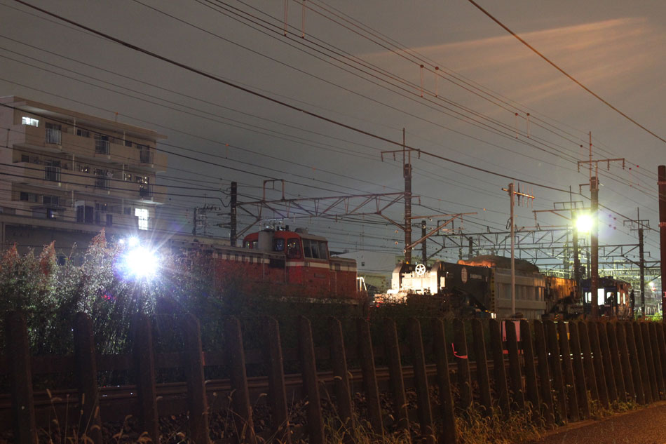この日は、変圧器輸送のため、2012年12月以来、約2年振りに八王子〜橋本間で特大貨物が運転されました。牽引はDE10 1663号機が担当しました。 ・1日深夜 前回からそんなに期間が開かずに運転されたこともあってか、橋本駅到着後の入れ換え作業はスムーズに進行。DE10機回し後、推進運転でこの位置へ。今回は雑草だらけでだらけでろくに撮れず。。。 ↑DE10 1663[新]+シキ801+ヨ8402@橋本付近 ゆっくりと京王の高架下、作業スペースへ。 前回とほぼ同様の位置に据付けし、確認作業を行って作業員の方々は一旦休憩に。 ・2日深夜 2日の日中、クレーンを使って変圧器の荷下ろしが行われ、空になったシキが帰って行きます。前回は相模線が遅れていた関係でホームから撮影できましたが、今回は既に手前の留置線(7番)に相模線車両が入ってからの入線でした。 八王子方に一旦引き上げ… 推進運転で5番線に入り、点検作業ののち発車まで待機となります。 遅い時間なので発車は待たずに帰宅。 今回は私有地侵入や、歩道に堂々と三脚を立てる方など、あまりルールがよろしくなかったのが残念でした。