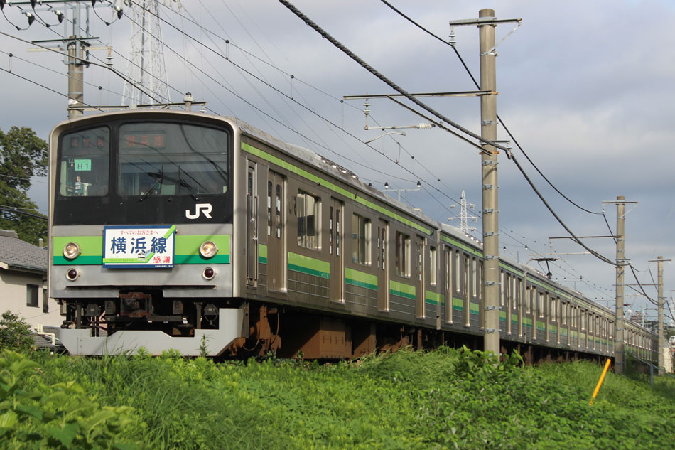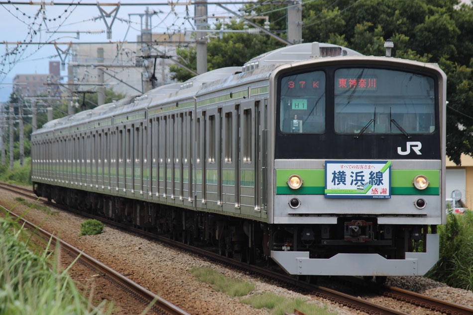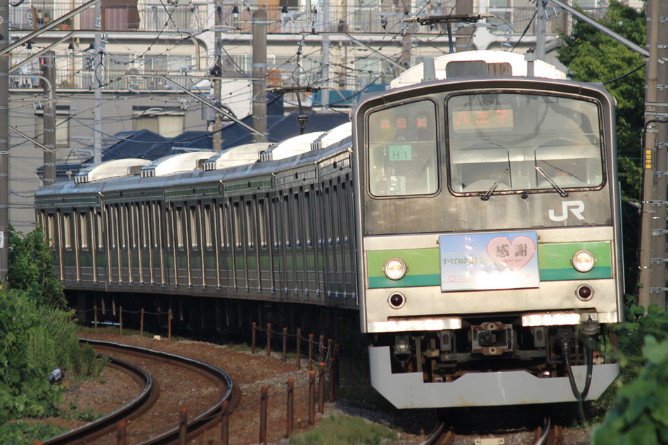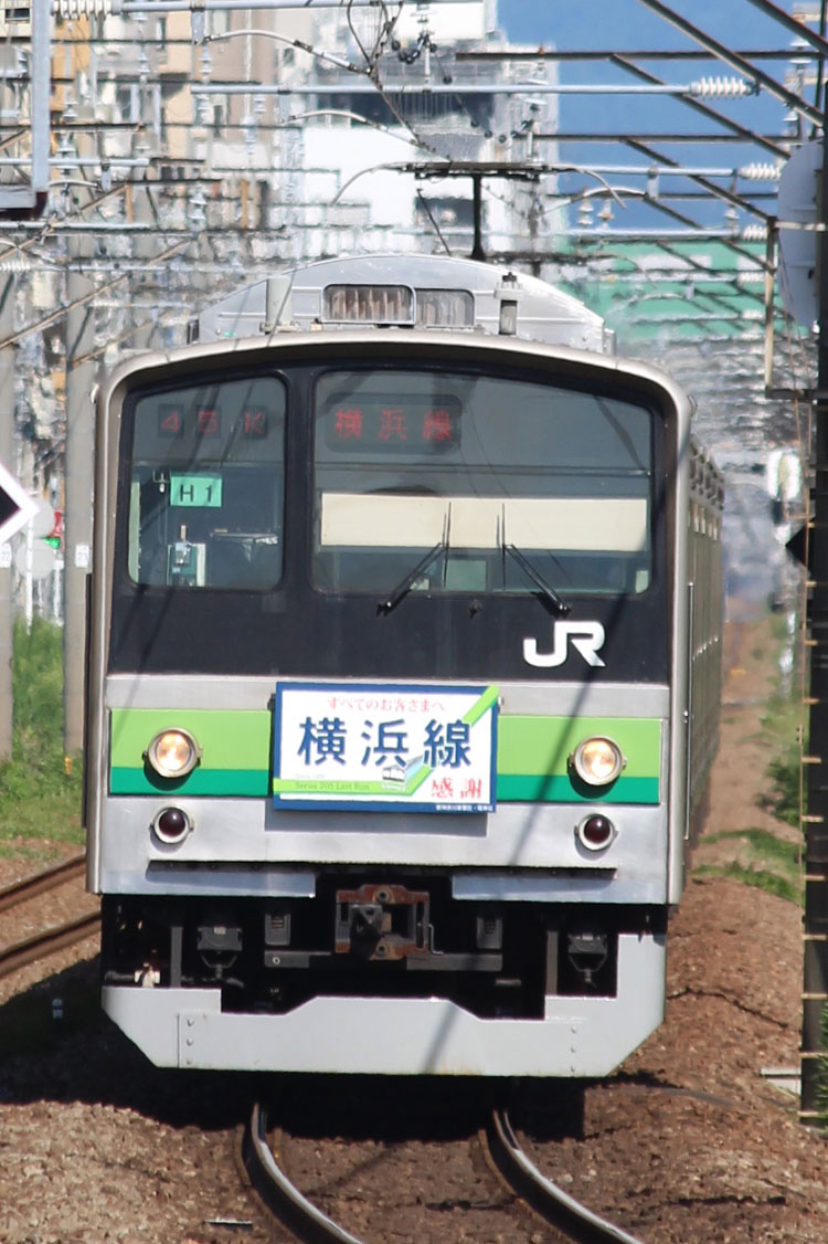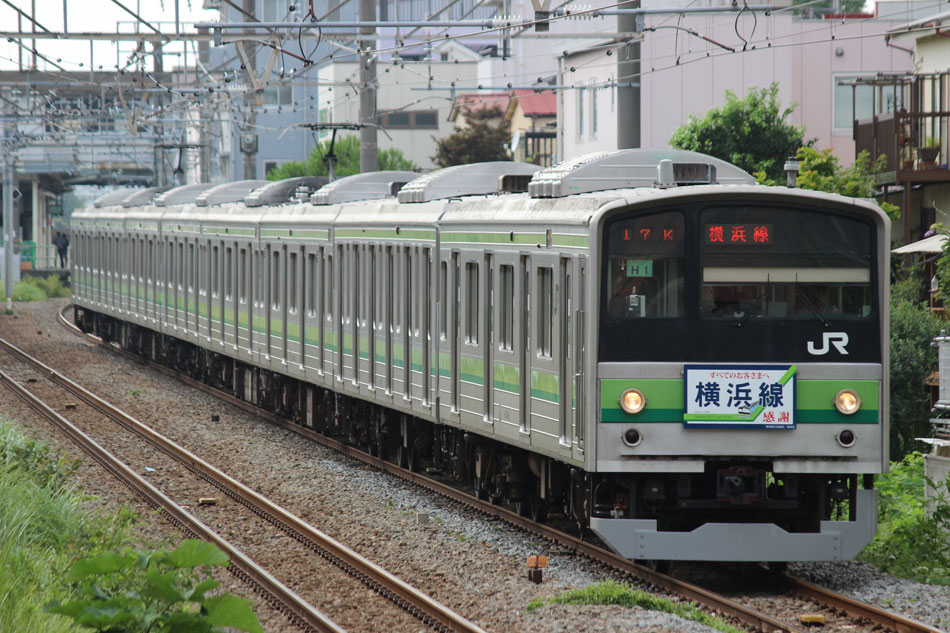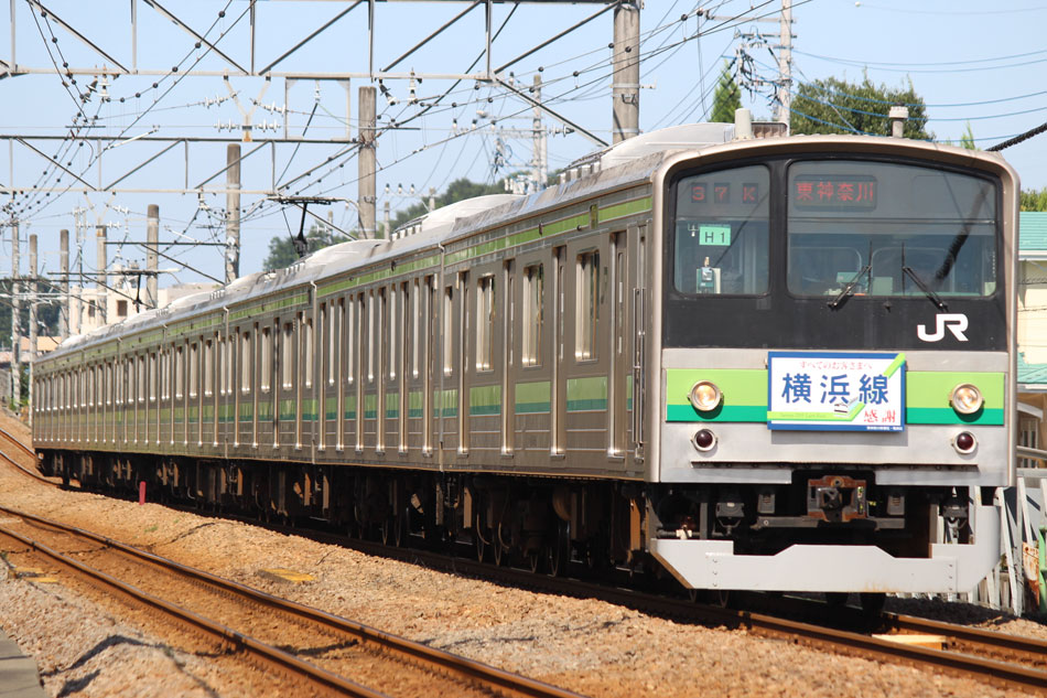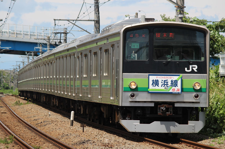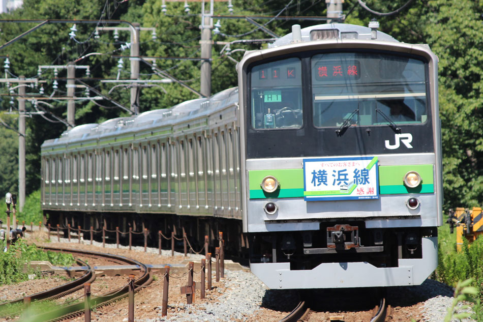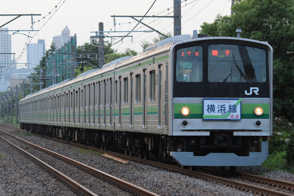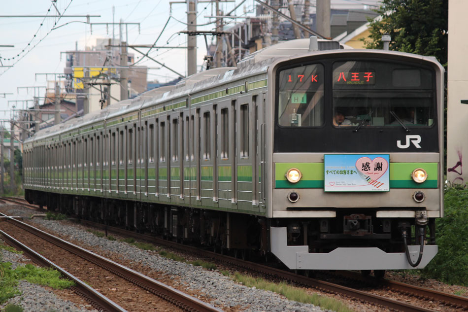・1日 7月29日に疎開返却されていたH23編成が、海外譲渡のためEF64 1032牽引で大船〜新津間で配給されました。 ↑配9766レ EF64 1032[長岡]+205系H23編成8B 譲渡配給@恵比寿〜渋谷間 また、H1編成に引退記念のヘッドマークが掲出され、03K(2)より運用を開始しました。 ↑2203K 各停"八王子行"@八王子 運用開始初便となった2203Kは八王子行きの最終電車、八王子駅に到着後はそのまま停泊。 ↑205系H1編成8B(HM掲出)@八王子(停泊) この日はムーンライト信州に乗って旅立ちましたので、この並びも。 ↑8421M 189系N103編成6B 快速"ムーンライト信州81号"&同上@八王子 2日・3日は新潟でJ-TREC新津〜新潟東港間の陸送や、東港で船積みを待つ205系を撮影してきました。こちらは別記事でまとめて掲載します。 ・3日 H1編成は23K。新潟帰りに町田に立ち寄って停泊する姿を撮影。 ↑205系H1編成8B(HM掲出)@町田(停泊) ・4日 H1編成は前日からの流れで39K。 ↑1139K 各停"橋本行"@矢部 橋本中線に疎開中のH28編成との並び。 ↑1238K 各停"桜木町行"&205系H28編成8B(疎開留置)@橋本 ・5日 H1編成は11K(1)で大船へ。 ↑810K 各停"大船行"@町田〜成瀬間 橋本中線に疎開していたH28編成が、疎開先を京葉車両センターに変更しました。鎌倉車両センターには入庫せず、町田駅で折り返しの上、直接新習志野に向かっています。 ↑回9591M 205系H28編成8B 京葉疎開@東浦和 かつて京葉線で共に活躍していた車両の出会い。 ↑同上&1*64E 209系M72編成8B 各停"府中本町行"@東浦和 ↑回9591M 205系H28編成8B 京葉疎開@越谷レイクタウン H1編成は11K(2)で鎌倉を出区。平日の11Kは、橋本派出ではなく京王線の高架下に停泊となります。 ↑205系H1編成8B(HM)@橋本付近(停泊) ・7日 H1編成は15K。ヘッドマークを付けての運用期間中、橋本派出で昼寝する運用に入ったのはこの日だけでした。10番線出区で残念賞。 ↑205系H1編成8B(HM) 出区@橋本派出 ↑1714K 各停"東神奈川行"@橋本〜相模原間 ・8日 5日に疎開先の国府津車両センターから返却されていたH14編成が、EF64 1032牽引で大船〜新津間で配給されました。 ↑配9793レ EF64 1032[長岡]+205系H14編成8B 譲渡配給@新宿〜池袋間 ↑同上@鴻巣 ↑同上@鴻巣〜北鴻巣間 H1編成は17K。終日運用ということで集中的に追っかけました。 ↑1116K 各停"東神奈川行"@相模原〜矢部間 ↑1217K 各停"橋本行"@矢部〜相模原間 ↑1316K 各停"桜木町行"@相模原〜矢部間 ↑1516K 各停"桜木町行" ↑1617K 各停"八王子行"@古淵〜淵野辺間 ↑1716K 各停"磯子行"@橋本〜相模原間 ・9日 H1編成は37K。橋本の七夕飾りを横目に八王子へ。 ↑1137K 各停"八王子行"@橋本〜相原間 ・10日 H1編成は39K。 ↑1438K 各停"東神奈川行"@長津田 ↑1539K 各停"橋本行"@成瀬〜町田間 台風接近の影響で、上りの特急"はまかいじ"が3時間以上遅れました。 ↑9064M 185系B3編成6B 特急"はまかいじ"@八王子(+192min) ・11日 H1編成は37K。837Kで町田行き表示を狙ったら表示負けしました…。 ↑936K 各停"桜木町行"@町田 ↑1136K 各停"東神奈川行"@淵野辺〜古淵間 ↑1536K 各停"東神奈川行"@片倉〜八王子みなみ野間 ↑2237K 各停"町田行"@町田 この期間の撮影分は以上です。撮影できなかった動きは以下のとおりです。 7月30日〜8月4日:H8編成が小山に一時疎開。 8月1日〜4日:H28編成が橋本中線に一時疎開。 8月4日〜9日:H27編成が小山に一時疎開。 8月5日〜8日:H8編成が湯河原に一時疎開。 8月5日:H027編成がJ-TREC横浜を出場し試運転。国府津車両センターにサハ204-114を除く7連で疎開していたH14編成が返却。 8月8日:03K(2)でH027編成が運用開始。 8月9日〜14日:H8編成が小山に一時疎開。