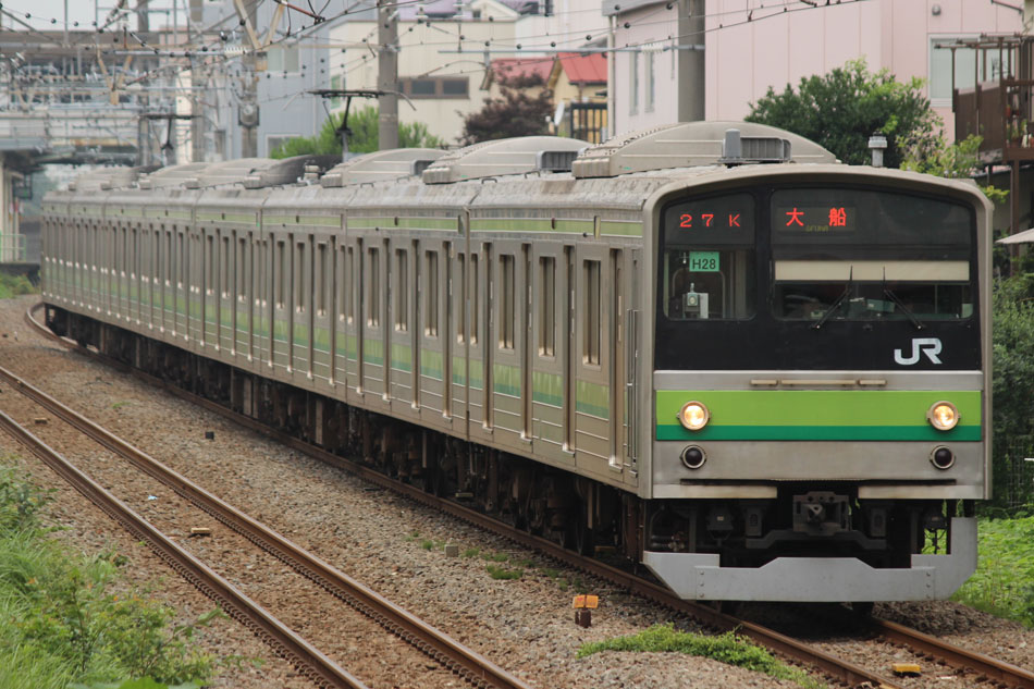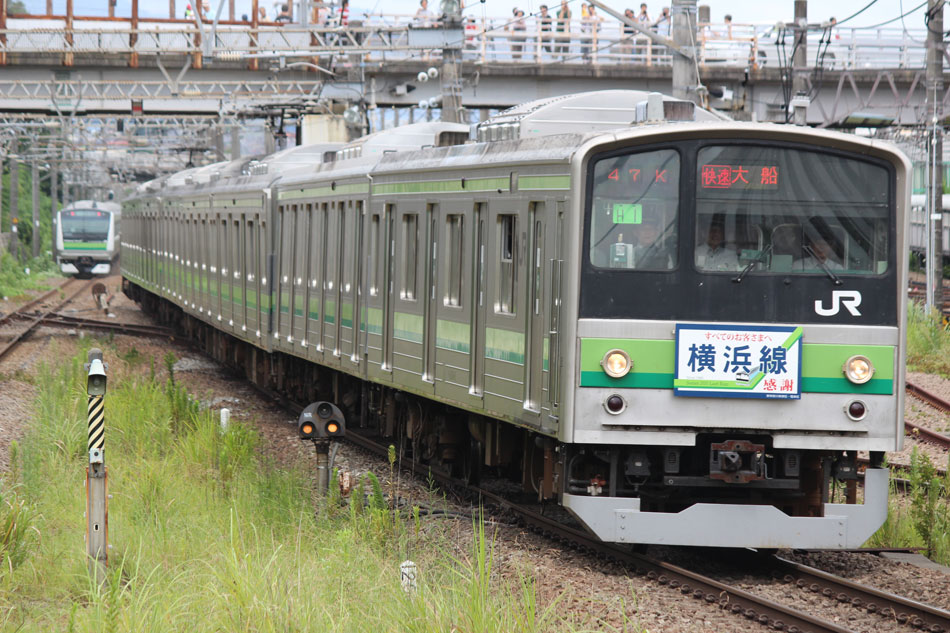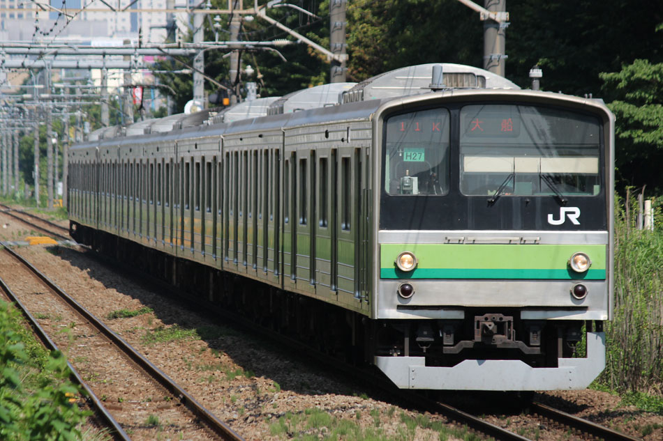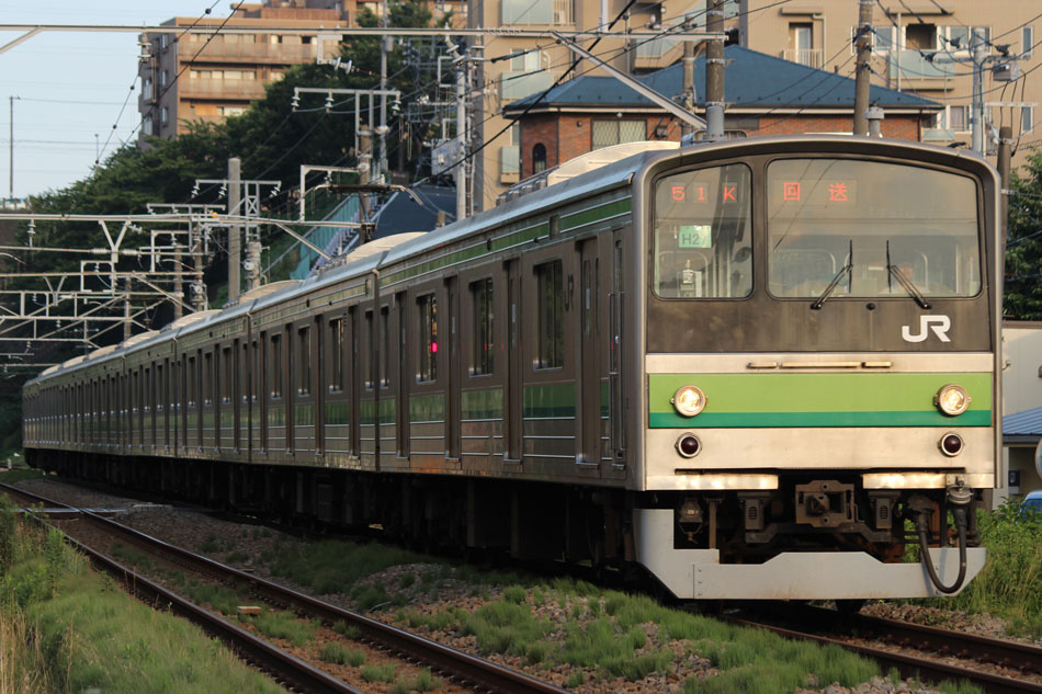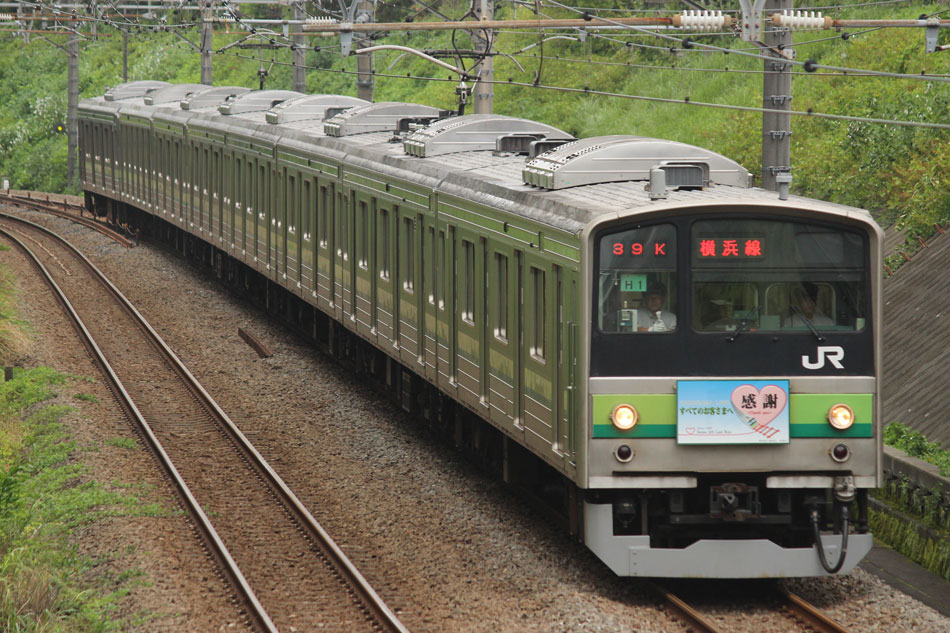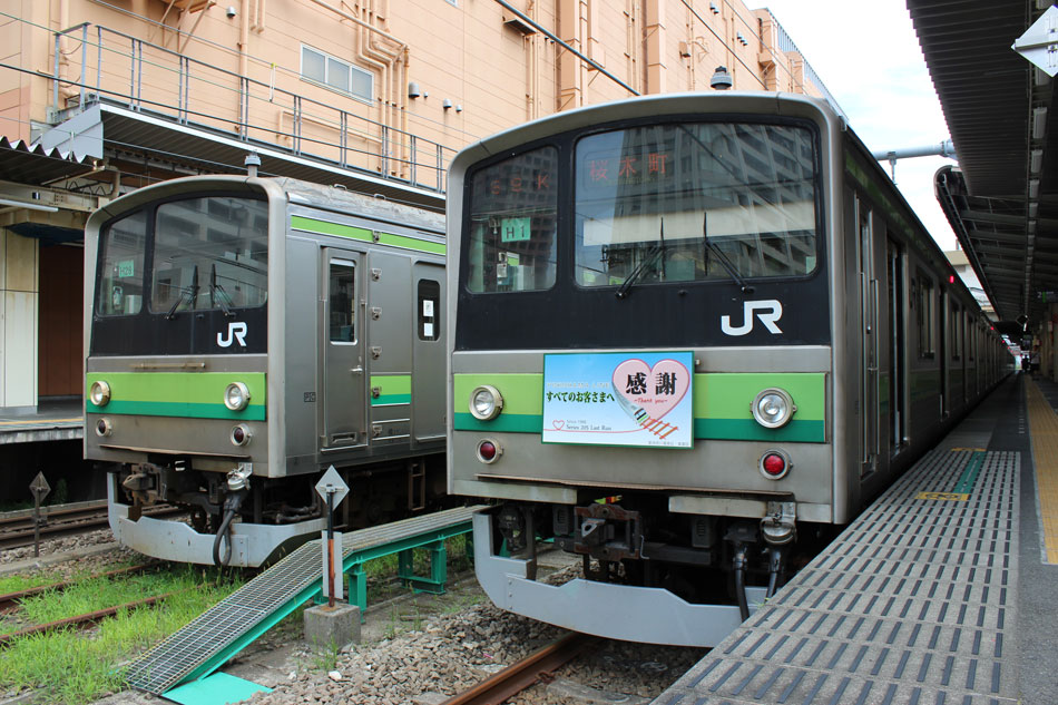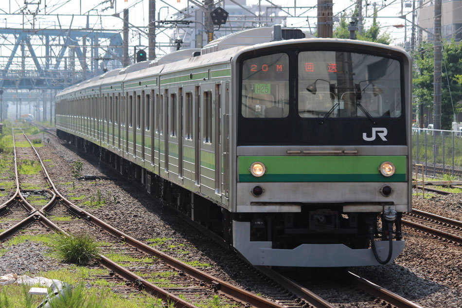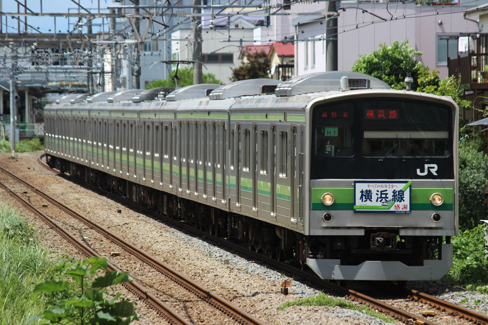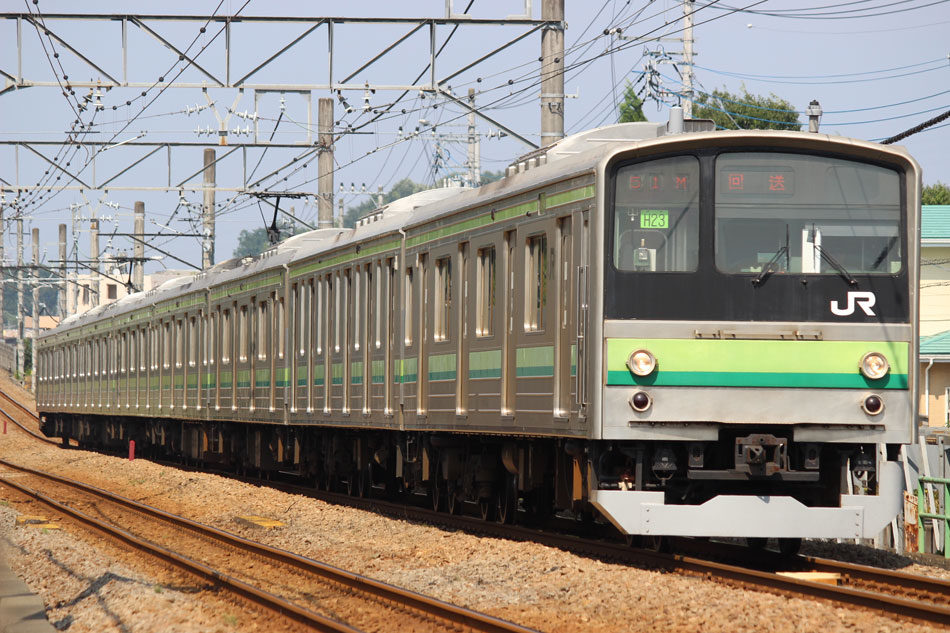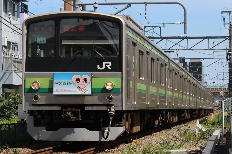 ・1日 7月29日に疎開返却されていたH23編成が、海外譲渡のためEF64 1032牽引で大船〜新津間で配給されました。 ↑配9766レ EF64 1032[長岡]+205系H23編成8B 譲渡配給@恵比寿〜渋谷間 また、H1編成に引退記念のヘッドマークが掲出され、03K(2)より運用を開始しました。 ↑2203K 各停"八王子行"@八王子 運用開始初便となった2203Kは八王子行きの最終電車、八王子駅に到着後はそのまま停泊。 ↑205系H1編成8B(HM掲出)@八王子(停泊) この日はムーンライト信州に乗って旅立ちましたので、この並びも。 ↑8421M 189系N103編成6B 快速"ムーンライト信州81号"&同上@八王子 2日・3日は新潟でJ-TREC新津〜新潟東港間の陸送や、東港で船積みを待つ205系を撮影してきました。こちらは別記事でまとめて掲載します。 ・3日 H1編成は23K。新潟帰りに町田に立ち寄って停泊する姿を撮影。 ↑205系H1編成8B(HM掲出)@町田(停泊) ・4日 H1編成は前日からの流れで39K。 ↑1139K 各停"橋本行"@矢部 橋本中線に疎開中のH28編成との並び。 ↑1238K 各停"桜木町行"&205系H28編成8B(疎開留置)@橋本 ・5日 H1編成は11K(1)で大船へ。 ↑810K 各停"大船行"@町田〜成瀬間 橋本中線に疎開していたH28編成が、疎開先を京葉車両センターに変更しました。鎌倉車両センターには入庫せず、町田駅で折り返しの上、直接新習志野に向かっています。 ↑回9591M 205系H28編成8B 京葉疎開@東浦和 かつて京葉線で共に活躍していた車両の出会い。 ↑同上&1*64E 209系M72編成8B 各停"府中本町行"@東浦和 ↑回9591M 205系H28編成8B 京葉疎開@越谷レイクタウン H1編成は11K(2)で鎌倉を出区。平日の11Kは、橋本派出ではなく京王線の高架下に停泊となります。 ↑205系H1編成8B(HM)@橋本付近(停泊) ・7日 H1編成は15K。ヘッドマークを付けての運用期間中、橋本派出で昼寝する運用に入ったのはこの日だけでした。10番線出区で残念賞。 ↑205系H1編成8B(HM) 出区@橋本派出 ↑1714K 各停"東神奈川行"@橋本〜相模原間 ・8日 5日に疎開先の国府津車両センターから返却されていたH14編成が、EF64 1032牽引で大船〜新津間で配給されました。 ↑配9793レ EF64 1032[長岡]+205系H14編成8B 譲渡配給@新宿〜池袋間 ↑同上@鴻巣 ↑同上@鴻巣〜北鴻巣間 H1編成は17K。終日運用ということで集中的に追っかけました。 ↑1116K 各停"東神奈川行"@相模原〜矢部間 ↑1217K 各停"橋本行"@矢部〜相模原間 ↑1316K 各停"桜木町行"@相模原〜矢部間 ↑1516K 各停"桜木町行" ↑1617K 各停"八王子行"@古淵〜淵野辺間 ↑1716K 各停"磯子行"@橋本〜相模原間 ・9日 H1編成は37K。橋本の七夕飾りを横目に八王子へ。 ↑1137K 各停"八王子行"@橋本〜相原間 ・10日 H1編成は39K。 ↑1438K 各停"東神奈川行"@長津田 ↑1539K 各停"橋本行"@成瀬〜町田間 台風接近の影響で、上りの特急"はまかいじ"が3時間以上遅れました。 ↑9064M 185系B3編成6B 特急"はまかいじ"@八王子(+192min) ・11日 H1編成は37K。837Kで町田行き表示を狙ったら表示負けしました…。 ↑936K 各停"桜木町行"@町田 ↑1136K 各停"東神奈川行"@淵野辺〜古淵間 ↑1536K 各停"東神奈川行"@片倉〜八王子みなみ野間 ↑2237K 各停"町田行"@町田 この期間の撮影分は以上です。撮影できなかった動きは以下のとおりです。 7月30日〜8月4日:H8編成が小山に一時疎開。 8月1日〜4日:H28編成が橋本中線に一時疎開。 8月4日〜9日:H27編成が小山に一時疎開。 8月5日〜8日:H8編成が湯河原に一時疎開。 8月5日:H027編成がJ-TREC横浜を出場し試運転。国府津車両センターにサハ204-114を除く7連で疎開していたH14編成が返却。 8月8日:03K(2)でH027編成が運用開始。 8月9日〜14日:H8編成が小山に一時疎開。