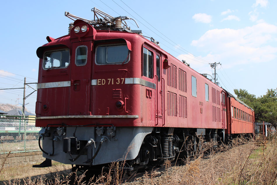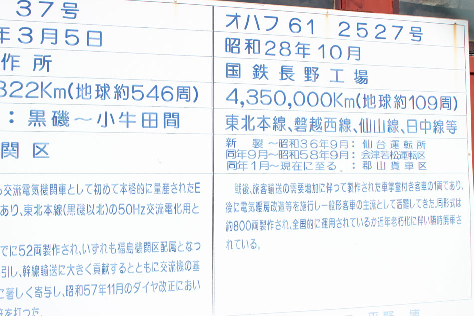 船岡城址公園での撮影を終え、船岡駅に戻ってきました。船岡駅前緑地のED71 37とオハフ61 2527を訪問。 まずはED71 37から見て行きましょう。 ・車歴 製造年月日:1961年3月15日 製造所:日立製作所 1961年3月15日 福島第二機関区 1982年11月 福島機関区にて廃車 本機は、昭和34年から交流電気機関車として初めて本格的に量産されたED71形式の37号機であり、東北本線(黒磯以北)の50Hz交流電化用として製作された。 同形式は昭和38年までに52両製作され、いずれも福島機関区配属となって東北本線の客貨車を牽引し、幹線輸送に大きく貢献するとともに交流機の基礎として他形式の製作に著しく寄与し、昭和57年11月のダイヤ改正において約20年の歴史に終止符を打った。(案内板より) ED75の登場まで東北本線で活躍した交流電気機関車。37号機は福島〜仙台間の電化に合わせて製造されたグループです。 製造銘板は残っていました。 ED71は、ここの37号機の他に1号機が新幹線総合車両センターに保存されています。こちらはホームから。 続いてオハフ61 2527。 ・車歴 製造年月 1948年10月 製造所 国鉄長野工場 1948年10月 仙台運転区 1961年9月 会津若松運転区 1983年1月 郡山貨車区 案内板はこちらです。 1947年に184人という多くの死者を出した八高線脱線転覆事故により、木造客車の脆弱性が問題視されたことから、木造客車の足回りを再利用して車体の鋼体化改造が行われた60系客車の1両。オハフ61 527として製造され、電気暖房装置取り付け時に番号が+2000されオハフ61 2527になりました。 ガラスは割れ、屋根も一部剥がれており状態は良くありません。 こちらはホームから。屋根の補修痕が目立ちます。 保存会が存在し、数年前に整備が行われたようですが、ED71はともかく旧客はかなり車体の腐食が進み危険な状態であるように見えます。駅前の目立つ場所に保存されているので、整備されると良いのですが…。 この後は、福島駅に戻って昼食を摂ってから485系"ジパング"の臨時快速などを撮影しに向かいます。続く。 PR コメントを投稿する