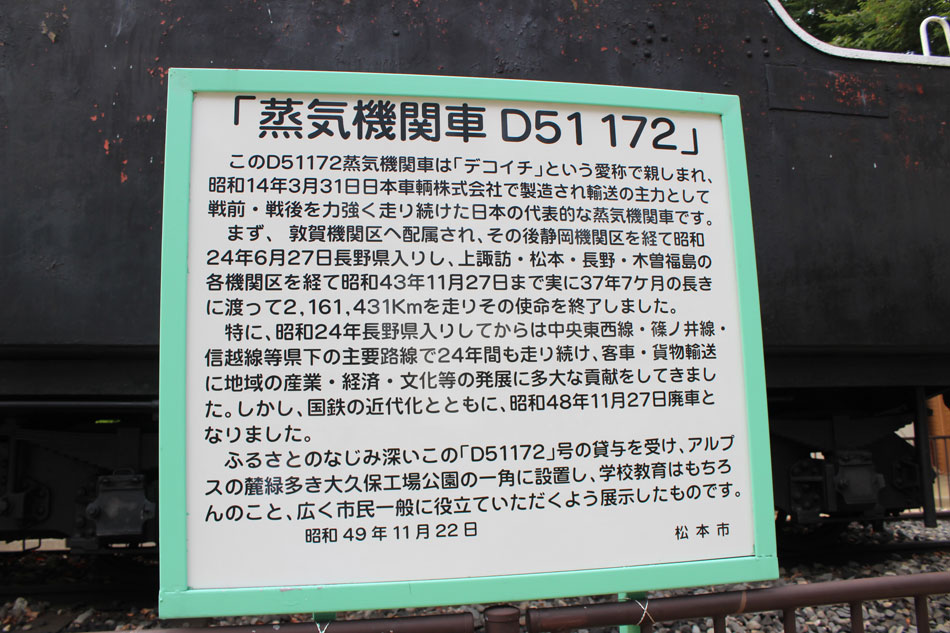 この日は、"ムーンライト信州81号"に乗って長野・新潟を青春18きっぷで旅してきました。 まずは再掲となりますが、八王子駅でのヘッドマーク付きのH1編成と"ムーンライト信州"の並び。この日の担当はN103編成。 ↑8421M 189系N103編成6B 快速"ムーンライト信州81号"&205系H1編成8B(HM掲出)@八王子 途中、踏切安全確認で止まりつつも松本には定時着。松本で自転車を出して、駅から2kmほどの大久保工場団地内にある大久保工場公園のD51 172号機を訪問。 ・車歴 製造年月日:1939年3月31日 製造所:日本車輌 1939年3月31日 敦賀機関区 1940年8月2日 静岡機関区 1949年6月27日 上諏訪機関区 1964年4月1日 長野機関区 1972年4月 木曽福島機関区 1973年11月27日 木曽福島機関区にて廃車 案内板はこちら。 経歴の通り、晩年は長野県内で過ごしたカマ。現役時代は集煙装置が取り付けられていたはずですが、保存時に取り外されたのでしょう。少し塗装に痛みはありますが厚塗り感は無く、現役時代に近い着飾らない姿です。 動輪は塗装されています。 側面プレート周り。キャブの窓はありませんが、札受けは残っています。製造銘板はありません。 キャブ内は公開されていますが、計器類の破損もありません。 後ろから。ステップが白く塗られているのはご愛嬌。 これにて撤収。松本駅に戻って駅の反対側へ移動して、国宝・松本城を見に行きました。 松本駅からは篠ノ井線で長野へ向かいます。続く。 PR コメントを投稿する