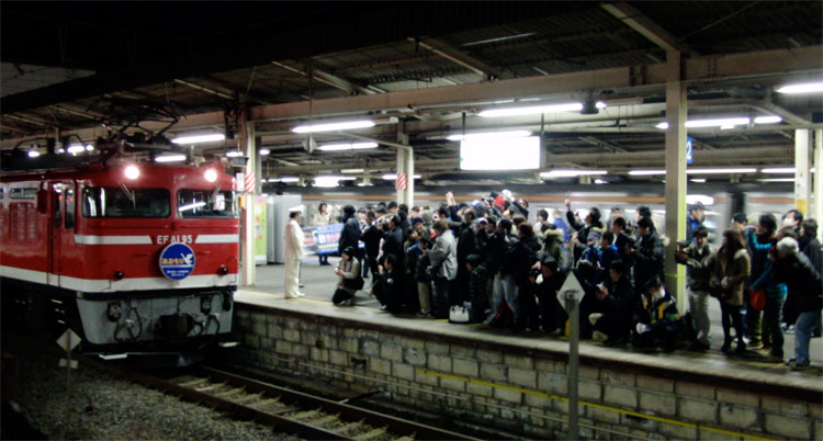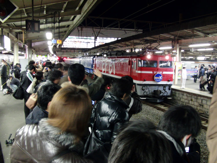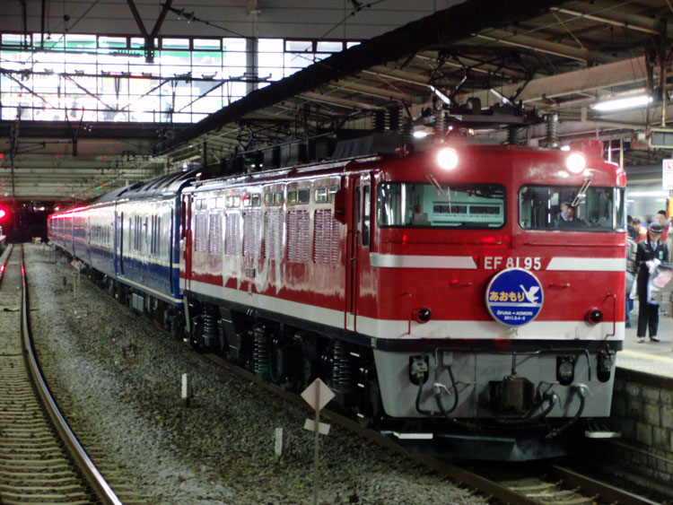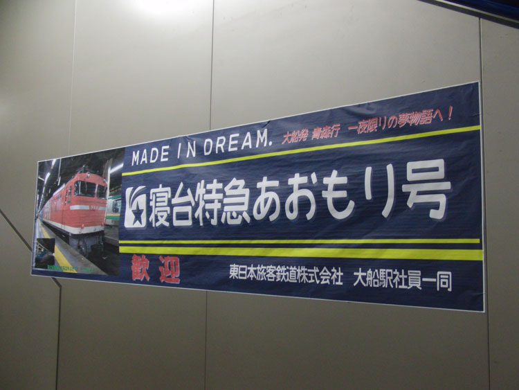 この日は、大船〜青森間(青森着は翌5日)で団臨「寝台特急あおもり号」が運転されました。送り込みの尾久〜大船間・本運転の大船〜新鶴見間はEF81−95とEF65−1118のプッシュプルで、本運転の新鶴見以降はEF81−95が単独で牽引しました。 始発駅の大船にて。小田原方にはEF65−1118。 東京方はとにかく凄い混雑。ろくに写真も撮れない状況でしたが、何とか頑張りました。EF81−95、特製のHMも掲出。 この後、汽笛を長く鳴らして発車していきました。 ホームには、運転記念のポスターが貼られていました。 続いて、横浜へ。追いついてしまったので一発。横浜駅もかなり混雑し、県警が出動。怒号が飛び交い、マナーがとても悪かった印象を受けました。 「はやぶさ」運転開始を記念して企画された今回の団体臨時列車、乗車にも、撮影にも、大変好評だったようです。再び運転されることがあれば良いと思います。当日の状況を見るに、再運転は無理そうですが・・・。当日の混雑の様子を下に掲載しておきます。 大船駅 団臨が発車する、6番線ホームの様子。 7番線ホーム側の様子。当日は、事故防止のため、すべての列車が8番線発着となりました。普段7番線に入線する鎌倉車両センターへの入庫列車も同様の措置がとられました。 横浜駅 3・4番線ホームより、5・6番線側の様子。 PR コメントを投稿する