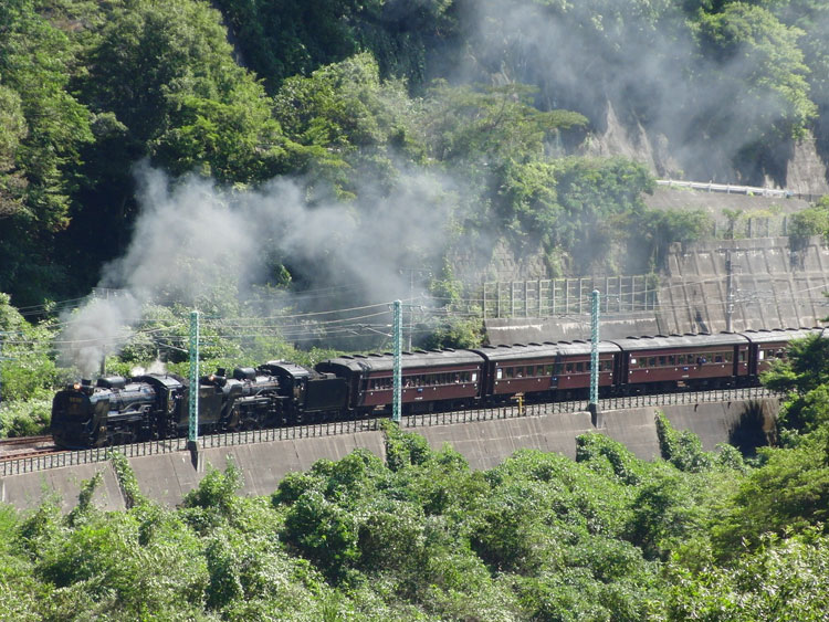それでは、いよいよメインの上越線重連に入ります。この日の組み合わせは、D51 498+C58 363。 往路は、上牧〜水上間の諏訪橋大橋から撮影です。台風の影響で川の水が汚いので、川は入れない構図で待機。先行する普通列車は、ぐんまDCのHM・ラッピングの115系でした。 さてさて・・・本番が近づいてきました・・・いい煙! 近づく近づく・・・あれ?C58の煙が・・・。 ベスト位置に来たら、D51 498の煙も薄く。 ・・・と思ったら、手前に来たら再び煙を吐き出しました。 まあ、悪くはないでしょう。後ろの旧客も写しておきます。 ということで、往路は煙はイマイチでしたが、やっぱり重連の迫力は単機とは違うものがありますね。続いて、水上駅の転車台広場に向かいました。続く。 PR | カレンダー