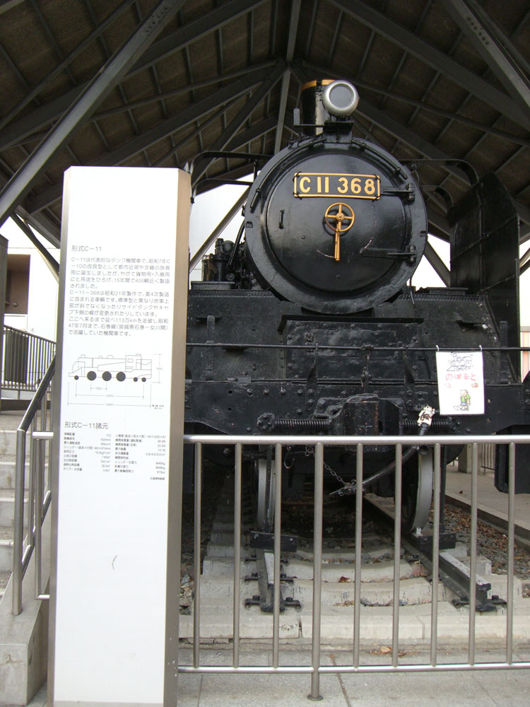・車歴 製造年月日 1946年12月26日 製造所 日本車輌 C−11は代表的なタンク機関車で、昭和7年C−10の改良型として都市近郊や支線の旅客用に誕生しましたが、やがて貨物用・入換用にと用途をひろげ、15年間で400機近く製造されました。 C−11−368は昭和21年製作で、第4次製造に含まれる車輛です。標準型と異なり炭車上部が斜でなくなったリサイドタンクやキャブ下側の線が変更されたりしています。 ここへ来るまでは延べ113万kmを走破し昭和47年7月まで、石巻線(宮城県石巻〜女川間)で活躍していた機関車です。 (案内板より) 震災による津波被害のため、現在も運転を見合わせている石巻〜女川間も走行していたカマ。 キャブには立ち入れません。荒廃しているようです。 全体を見るには、後ろからしか撮れません。 以前はホームレスの住処になって大変荒廃していたこのカマですが、2005年に再塗装されて綺麗になりました。これからも大事に保存されてほしいものです。 PR コメントを投稿する