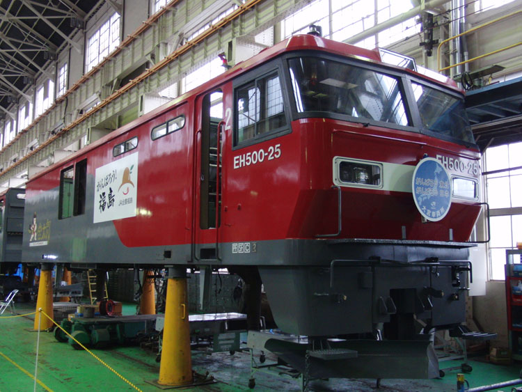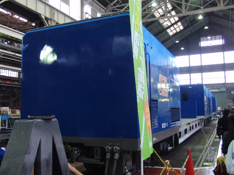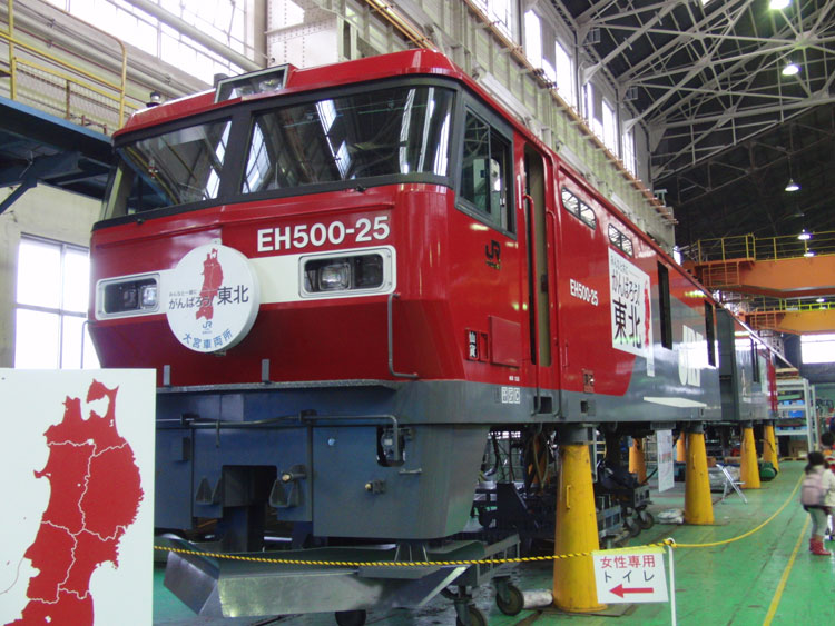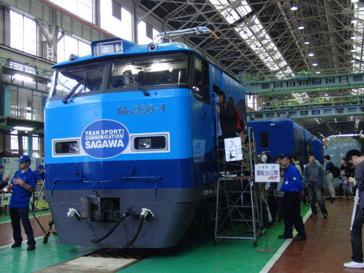 大宮公開2011。JR貨物の大宮車両所へと進みます。 今年の吊り上げ実演は愛知機関区所属のEF64−1028が使用されました。 実演終了後。1エンド側のHMは「あけぼの」。 2エンド側は特製の「絆」。 仙台総合鉄道部所属のDE10−1120。 反対側2エンドは分解された状態。 頭だけ横に置かれていました。 EH500−25の2エンド側。特製の「がんばろう東北 がんばろう日本」HM。 1エンド側は「みんなと一緒に 頑張ろう東北!」 ちょっと離れたところには、さいたま新都心残土輸送の際に使用されたHMでEF65−1070が展示されていました。出場間近ということで、パン上げ・ライト点灯の状態でした。 東京貨物ターミナルから梅田貨物ターミナルまで、深夜〜早朝の東海道線で運転されている「スーパーレールカーゴ」用のM250系電車が入場中。 運転台の見学もできたようです。以前はちゃんとHMが掲出されて運転されていましたが、現在はシール式のものに交換されてきています。 外へ。元九州色の、新鶴見機関区所属DE10−1556が展示。 EF64−1020もちょっとだけ。 この後は、JR東日本の入場車両を見に行きます。続く。 PR コメントを投稿する