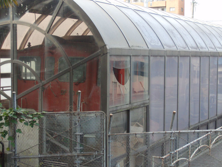 EH10 61号機の後は、15分ほど歩いた菅原天満宮のすぐ横にあるDF50 4号機を訪問。 製造年月日 1957年3月27日 製造所 三菱重工 1957年3月27日 敦賀機関区 1965年8月27日 亀山機関区 1980年3月17日 亀山機関区にて廃車 この機関車は 昭和32年 蒸気機関車にかわる本格的なディーゼル機関車として登場し 昭和38年までに138両が製造されました 機関車番号のDはディーゼルエンジン Fは動輪の軸数 50は速度記号 4は製造順位を表しています ディーゼルエンジンは スイスのスルザー社製で このディーゼルエンジンで発電した電気を動力源として6個の電動機で動輪を駆動して走ります この機関車は 昭和32年から23年間に 山陰 北陸 篠ノ井 中央 紀勢本線で228Km(地球を約57周)走り続け 旅客列車の無煙化に大いに貢献しました なお この形式のディーゼル機関車の展示は わが国では初めてのことです (案内板より) シェルターと金網に囲まれて保存されています。以前は内部が公開されていたようですが、現在では公開されず、また倉庫代わりとして使われているようです。 貴重なDF50、どうやら近くの幼稚園?保育園?所有らしいのですが、面倒になって公開も整備もやめてしまったのでしょうか?残念です。 反対側はかなり霞んだ状態。 訪問した際、道に迷って困っていた所を地元の方に案内していただいたのですが、その方もこの車両があることを知らなかったようです。こんな状態では地元での知名度も低いのでしょうね。 この後は、閉園した「エキスポランド」→「ファームエキスポ」のD51 764号機を訪問。続きます。 PR | カレンダー