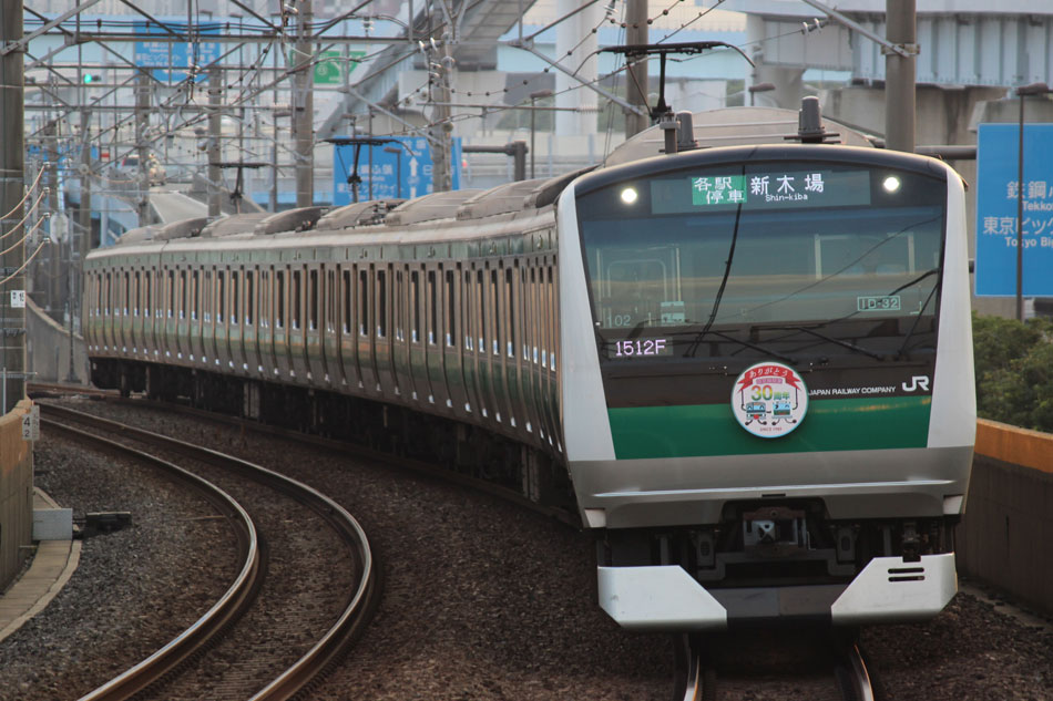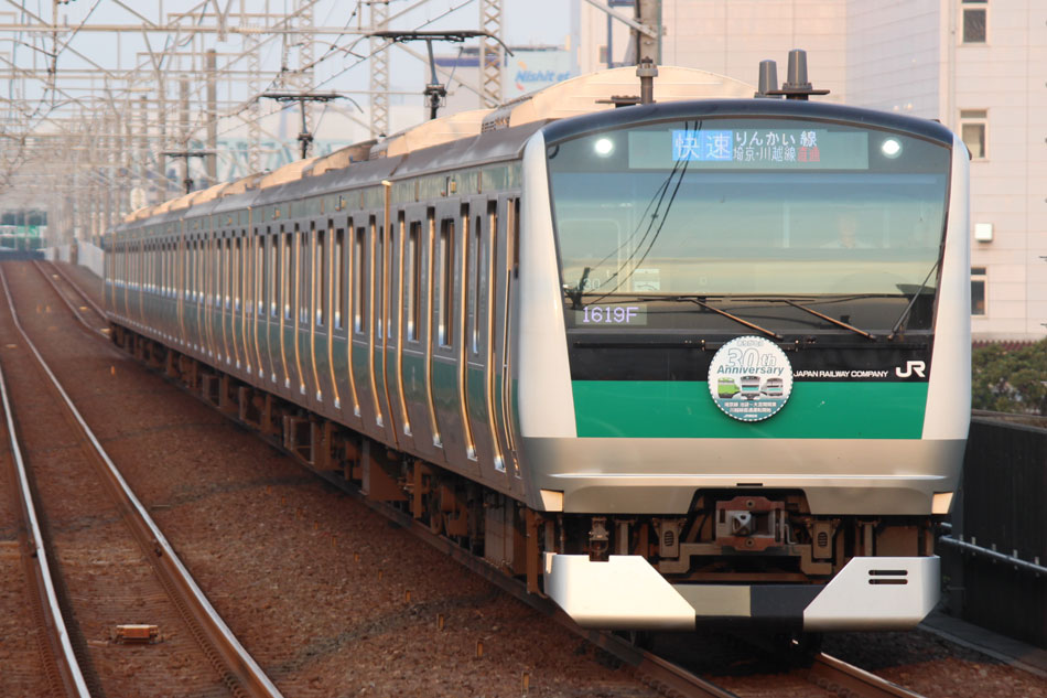 この日は、埼京線(池袋~大宮間)が開業30周年を迎えたことを記念して、ヘッドマークが4編成に掲出されているということで、舞浜に行った帰りに東雲に寄り道。 ヘッドマークは各編成ごとに異なる計4種類が、池袋駅・大宮運転区・大宮車掌区・川越車セの社員の考案により制作されました。ハエ130編成は、103系・E233系・205系が並ぶデザイン。 ↑1418F ハエ130編成10B 各停"新木場行"@東雲 ↑1619F ハエ130編成10B 快速"川越行"@同上 先頭車両の側面には、その編成のヘッドマークと同様の絵柄の装飾も。 ハエ102編成は、キャラクター風にデフォルメされた205系とE233系のデザイン。 ↑1512F ハエ102編成10B 各停"新木場行"@同上 残りの2編成は、機会が合わず撮影できないまま期間が終了してしまいました。残念。 | 次のページ>> | カレンダー