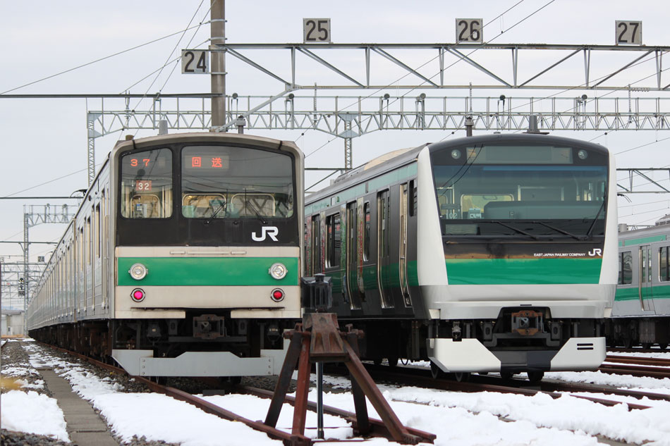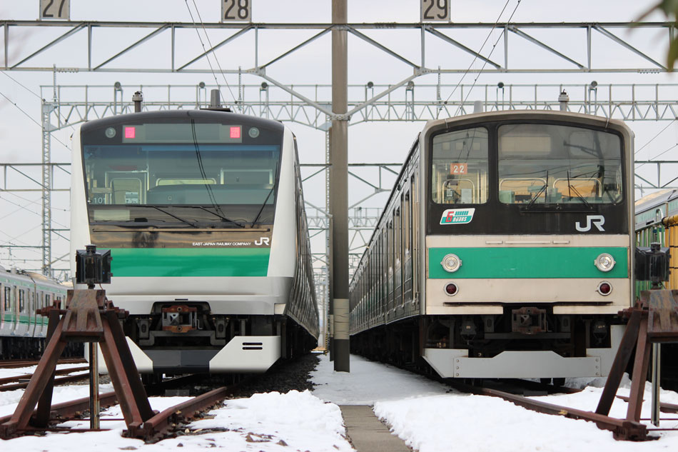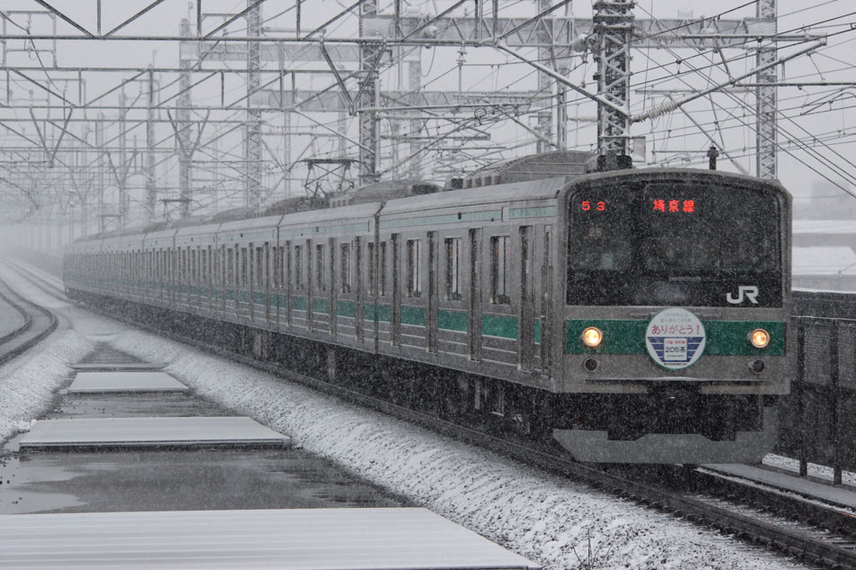 川越車両センターでH002編成を見た後、ハエ22編成に代わってありがとうヘッドマークを掲出したハエ28編成が雪の中運用に就いているということで埼京線に移動。 さすがに雪ということもあってか撮影者は少なめでした。前後でデザインの違う2種類のヘッドマークを掲出。 ↑1352K 205系ハエ28編成10B(HM掲出) 各停"大宮行"@与野本町 ↑1453K 205系ハエ28編成10B(HM掲出) 各停"新宿行"@武蔵浦和 結局ヘッドマーク掲出期間中はこの時しか撮影に恵まれず。ハエ28編成が3月以降もヘッドマークを外して現在まで運用に就いているのはご存知の通りです。