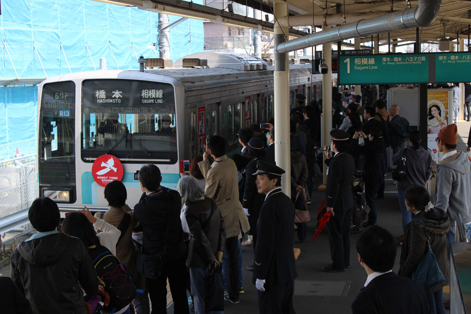 3月22日より、相模線沿線の魅力アップ、「さがみロボット産業特区」の周知広報を目的として、相模線で1編成(R13編成)4両が"アトムトレイン"としての運行を開始しました。側面には公募で選ばれた「未来のハカセたち」をラッピングし、「さがみロボット産業特区」のイメージキャラクターである鉄腕アトムのヘッドマーク(1種類)を掲出、更に車内の一部座席が「アトムシート」に交換され、運行期間は約半年間の予定とされています。 初日は67F(2)で運用入り、1267F(茅ヶ崎12:18発)から運用開始。一番列車には、側面のラッピングのモデルとなった子供とそのご家族の方が招待されました。 ↑招待客に迎えられて茅ヶ崎駅に入線する一番列車 ↑いつもは閑散としている昼下がりの茅ヶ崎駅相模線ホーム、この日は招待客と主催の県市町等の方で賑わいました ↑記念撮影用の横断幕も登場 盛況の様子はここまでとして、"アトムトレイン"となったR13編成にいくつかの変化が見られましたので取り上げておきます。 ・新ドアステッカーの貼付 ドアボタンの換装(金属製からシリコン製のものに)が終わったのが年末頃ですので約3ヶ月後ということになりますが、ボタン式ドアについての新ドアステッカーが追加されました。 こちらのステッカー、裏側は戸袋引き込み注意の啓発ステッカーになっているのですが、沿線自治体のゆるキャラが書かれており、それぞれのドアで異なる仕様になっていました。 ↑さがみん(相模原市)、ざまりん(座間市)、えび〜にゃ(海老名市)、あゆコロちゃん(厚木市)、コロ坊(寒川町)、えぼし麻呂(茅ヶ崎市) 車内側のボタンにも同様に貼付されているため、今後も他編成に普及するものと思われますが、自治体のゆるキャラが使用されるかは不明。 ・車内の様子、照明換装 「アトムシート」はR13編成の他にも2編成に設置されますが、R13編成では橋本方先頭車のクハ204-513山側に設置されています。さらに、こちらは帰宅後に気付きましたが、車内の照明もLED蛍光灯に換装されています。震災後から一部取り外されていた蛍光灯が全て取り付けられたこともあり、車内が非常に明るくなった印象です。。 「アトムシート」にはアトムの「7つのチカラ」が描かれています。4両のうちの1両、片側1つだけというのは少し残念。 ・中吊り R13編成の中つりは、1ヶ月限定で沿線自治体の魅力と「さがみロボット産業特区」について紹介するポスターになっています。 初日は運用変更も無く、1966Fで無事に運用を終えました。 ↑1966F 205系R13編成4B(アトムトレイン) 普通"茅ヶ崎行"@橋本 相模線205系としては2011年3月の開業90周年・全通80周年・電化20周年記念ヘッドマーク以来4年振りのヘッドマーク掲出となります。(掲出が始まってすぐに東日本大震災が発生し、相模線は計画停電の影響で運転再開が長引いたこともあり、ヘッドマークは震災後すぐに外されました)。側面へのラッピングは1991年の電化以来初めてのことと思われます。今回は何事も無ければ約半年間ありますので、いろいろな場所・いろいろな場面で撮ってみようと思っています。 | カレンダー