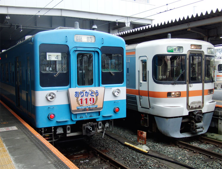 蒲郡からは、東海道本線に乗って豊橋へ。 飯田線で長らく活躍した119系は、213系の転属に伴い3月で運用終了となりましたが、さよなら運転が3月中に何度か行われました。この日は、豊橋〜豊川間で「119ファイナル号」が旧塗装のE9編成を使用して運転されました。 豊橋では、313系と並びました。 この313系に乗って牛久保へ。走行写真も撮影。 この後、119系は西浜松へと回送され、大半の編成は今も留置中となっています。119系、お疲れさまでした。 牛久保からは後続列車に乗って、豊川へ。豊川稲荷から名鉄豊川線に乗車。 この後は、日本車輌豊川製作所の保存車を訪問。続きます。 −おまけ− 牛久保駅。