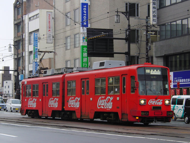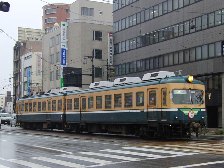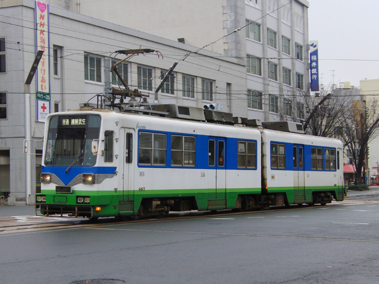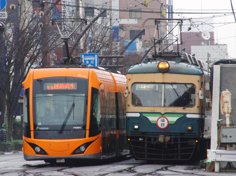 本町第3公園のC58 212号機を訪問した後は、敦賀駅に戻ります。 敦賀駅からも引き続き北陸本線、521系の芦原温泉行きに福井駅まで乗車します。 ↑235M 521系G11編成2B 普通"芦原温泉行"&5054M 683系*B 特急"しらさぎ54号"@敦賀 敦賀駅を発車すると、全長13,870mある非常に長いトンネル「北陸トンネル」に入ります。狭軌の陸上鉄道トンネルとしては現在でも日本最長で、以前トンネル内で火災事故が発生したこともありました。 トンネルを抜けると雪が降り出し、うっすらと積雪もありましたが、すぐに線路際の雪は見えなくなりました。武生駅では特急サンダーバード1号を退避します。 ↑4001M 683系T44編成9B 特急"サンダーバード1号"@武生 9分停車の後発車、20分程で福井駅に到着しました。 福井駅前には、路面電車の福井鉄道福武線が乗り入れています。福井鉄道では元名鉄の低床車両に混ざって、朝夕ラッシュ時を中心に自社発注の200形と元名古屋市交通局の600形・610形の大型車が運用されています。そのうち、200形は車歴50年を超えて老朽化が進んでいるため、2016年までに全車置き換えが発表されており、地方私鉄の自社発注車の貴重な生き残りとして最後の活躍を見せています。 今回はそんな200形を狙っての福井鉄道撮影ですが、3編成のうちすでに201編成は運用を離脱しており、残るは新福鉄色の202編成と福鉄急行色の203編成のみ。特に製造時のカラーである203編成が撮れれば万々歳ですが、果たして? 福井駅前に乗り入れているのは「ヒゲ線」と呼ばれる支線で、乗り入れない列車があるので、全列車が通る市役所前駅へ。まずやってきたのは元名鉄の低床車。 ↑924レ 福井鉄道886編成2B "越前武生行(福井駅前経由)"@市役所前〜福井駅前 ヒゲ線に入った列車は福井駅前で折り返し、再び市役所前に戻ってきます。 ↑同上@福井駅前〜市役所前 さらに市役所前で折り返し、越前武生方面に向かって発車。 ↑同上@市役所前〜公園口 今度は越前武生方面から列車が接近…ですが、こちらも元名鉄の低床車。こちらの編成にはコカコーラのラッピングがされており、名鉄時代の面影を残す様態になっていますね。 ↑849レ 福井鉄道888編成2B "田原町行(福井駅前経由)"@公園口〜市役所前 この時点で本来の予定ではタイムリミットですが、やっぱり諦められず普通列車を1本遅らせることに。 888編成が福井駅前で折り返して市役所前に戻ると、今度は田原町方面から「FUKURAM」ことF1001編成が登場。こちらの形式が大型車を置き換えています。 ↑944レ 福井鉄道F1001編成3B "越前武生行(福井駅前経由)"@市役所前〜福井駅前 そして越前武生方面からやってきたのは…福鉄急行色の203編成! ↑909レ 福井鉄道203編成2B "田原町行(福井駅前経由)"@公園口〜市役所前(上記2点) 市役所前で折り返している間に福井駅前から"FUKURAM"が入線、新旧の並びも実現。 ↑944レ 福井鉄道F1001編成3B "越前武生行(福井駅前経由)"&同上@市役所前 市役所前に停車している間に、福井駅前寄りに移動。パンタの有無で顔つきが違って見えますね。 ↑同上@市役所前〜福井駅前 福井駅前では2分ほどの停車時間ですぐに折り返し、田原町に向かって再び市役所前を通ります。この日はクリスマスイブ、大きなツリーが飾られていたのでそちらも絡めて。 ↑同上@福井駅前〜市役所前(上記2点) 大型車、さらには本命だった福鉄急行色の203編成を撮影できて大満足。これにて福井を撤収し、1本遅らせた北陸本線に乗って富山を目指しますが、昼食時間の確保のため加賀温泉から金沢まで禁じ手を利用し、富山には予定通りの時間に到着しました。富山ではデカ目の475系がお出迎え。 ↑545M 475系A15編成3B "直江津行"@富山 この後は、富山で昼食を摂り、富山地鉄の「ダブルデッカーエキスプレス」の撮影に向かいます。続く。