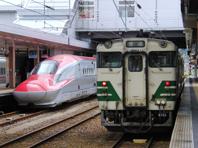 急行"はまなす"を撮影後は、一度宿泊先のホテルに戻り朝食を摂り、青森駅前のねぶた展示施設「ワラッセ」を見学。 ねぶた祭り期間中は観光客が多く混乱しそうなのでわざと外したのですが、おかげで館内には観光客も少なくゆっくり回ることができました。動いているねぶたは地元のお祭りで十分です。 見学終了後は青森駅から特急"つがる4号"に乗車して秋田へ。 ↑2044M E751系A-102編成4B 特急"つがる4号"@青森 秋田駅ではこんな並びも。 ↑1131D キハ48-***+キハ48-*** "男鹿行"&E6系7B"スーパーこまち*号"@秋田 昼食。比内地鶏の親子丼と稲庭うどんのセット。 秋田からは奥羽本線に乗って土崎駅に向かいますが、遅れていた特急"いなほ1号"の接続を取ってからの発車になるということでこちらの"いなほ1号"を撮影。前面LEDが故障しているR28編成でした。 ↑2001M 485系R28編成6B 特急"いなほ1号"@秋田(+1h40min) 接続待ちの影響で18分遅れて発車、一駅だけ乗車して土崎駅で下車。雲行きが怪しくなってきました…。 まだ日差しはあるので、予定通り土崎カーブに移動し、秋田貨物駅から秋田港駅を結ぶ貨物列車を撮影。短い区間ではありますが、DE10が堂々の本線牽引! ↑950レ DE10 1643[東新]+コキ1*B@土崎〜秋田貨物間 701系と男鹿線のキハも通過していきました。 ↑1652M 701系N30編成2B 普通"酒田行"@土崎〜秋田間 ↑1135D キハ48-***+キハ48-*** 普通"男鹿行"@秋田〜土崎間 この後は、土崎児童公園に保存されているD51 370号機を訪問。続きます。