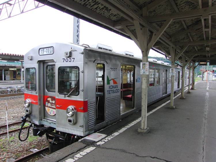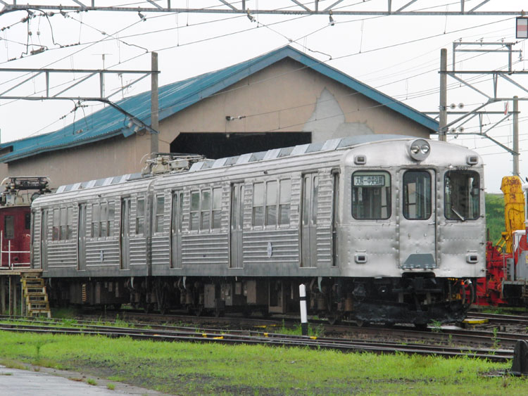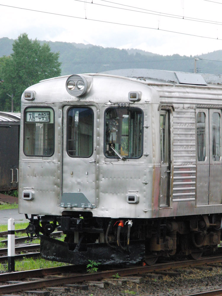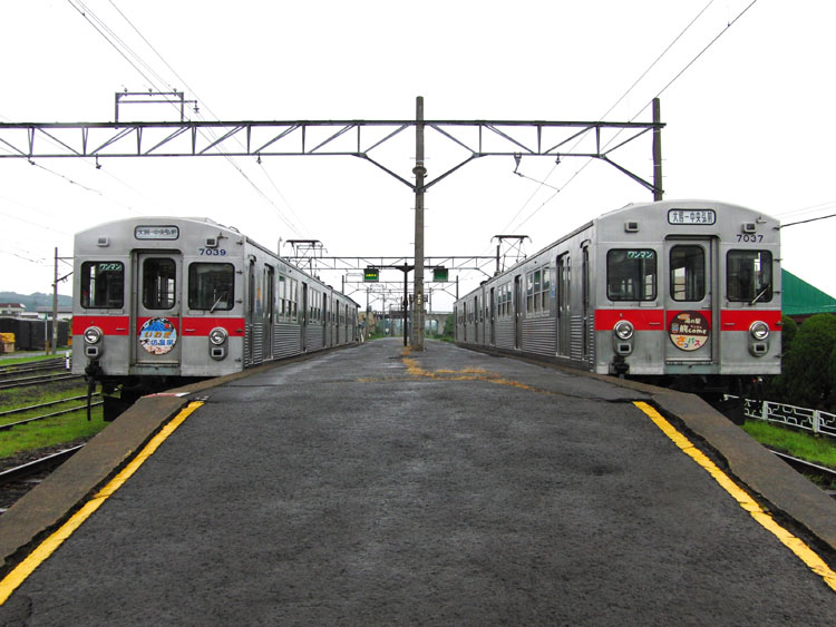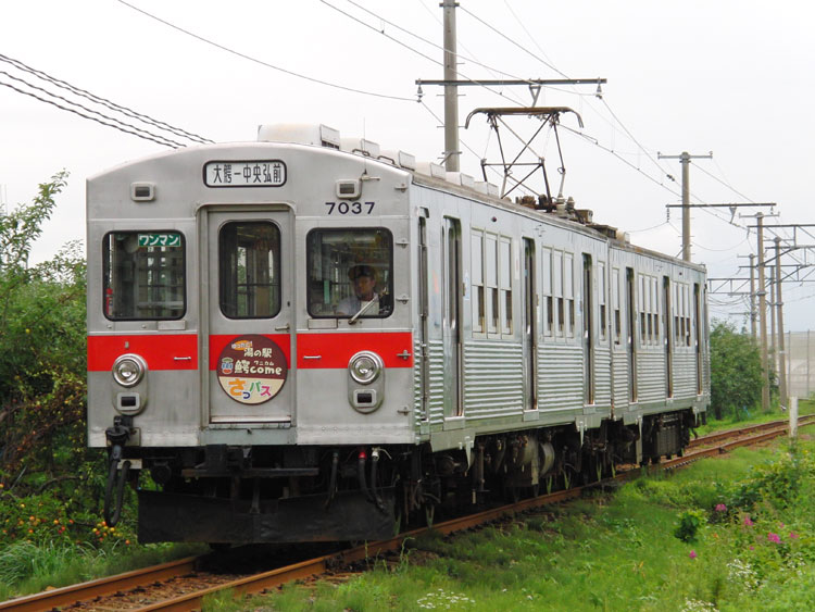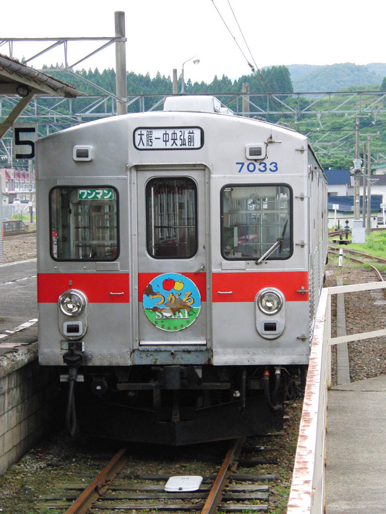 津軽新城駅で24系の天理臨を撮影した後は、弘前行きの普通列車に乗って弘前駅へ。 弘前駅では秋田行きの接続が無く、約1時間半の乗換時間の間に昼食。駅前で適当な店を探そうと歩くも見つからず、オープンしたばかりらしいショッピングモールのフードコートへ。津軽うどんの店が入っていましたのでそちらで。 その後も時間を潰して秋田行きの普通列車に乗車、大鰐温泉駅へ。大鰐温泉駅で弘南鉄道大鰐線大鰐駅に乗り換え。弘南鉄道は東急7000系の譲渡車両が未だ現役で、イベント時には東急6000系も運行されます。また各編成にヘッドマークが掲出され、そのバリエーションも様々です。こちらの編成は「さっパス」の告知HM。 ↑25レ 弘南鉄道7037F 2B "中央弘前行"@大鰐 5番線には7033Fが留置。日中は4番線を主に使っているようです。こちらは沿線の高校のHM。 ↑弘南鉄道7033F 2B@大鰐 7037Fに乗車。車内はつり革がりんごを模したものになっており、広告欄も地元の広告が掲載されていましたが、座席側には「東横のれん街」が残っていました。東急時代のものをそのまま使っているんですね。 弘南鉄道は初乗車となりますが、発車前に大粒の雨が降ってきてしまいました…このまま降るようだとこの後予定している撮影はどうしようかなあ…と思いつつ、津軽大沢駅で下車。ここは大鰐線の車両基地がある駅で、日中の交換はこの駅で行なわれます。 ↑25レ 弘南鉄道7037F 2B "中央弘前行’&26レ 弘南鉄道7039F 2B "大鰐行"@津軽大沢 こちらにやってきた理由はもちろん6000系の撮影、6000系は2006年以降定期運用を持たないので、イベント時以外はここの車両基地に2編成とも留置されています。 東急6000系は日本初のステンレスカーである5200系の後継車両として4両編成×5本が製造されました。その後の増備はなかったものの、一部はVVVFインバータ制御の試験車両として運用されるなど、現在でも東急で運用されている車両の基礎となった部分が多いことが特徴です。東急時代には東横線・田園都市線・大井町線・目蒲線とほぼ全ての路線で運用され、廃車後に量産仕様の2編成がこの弘南鉄道に譲渡されました。 その後の東急車両に類を見ない、なんともいえない表情が魅力的。 6000系の撮影を終えると、雨は小降りになってきました。傘もいらない程度になったので、予定していた撮影地へ徒歩で移動し、まずは中央弘前行きから撮影。 ↑27レ 弘南鉄道7039F 2B "中央弘前行"@義塾高校前〜津軽大沢間 津軽大沢で交換した大鰐行きもすぐに来るので逆を向いて。 ↑28レ 弘南鉄道7037F 2B "大鰐行"@津軽大沢〜義塾高校前間 これにて大鰐線の撮影は終了。義塾高校前駅からJRの石川駅へは歩けるので、数分歩いて石川駅から奥羽本線に乗車、雨で露出も無いのでそのまま青森へ。2022レを撮影します。続く。