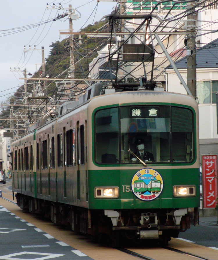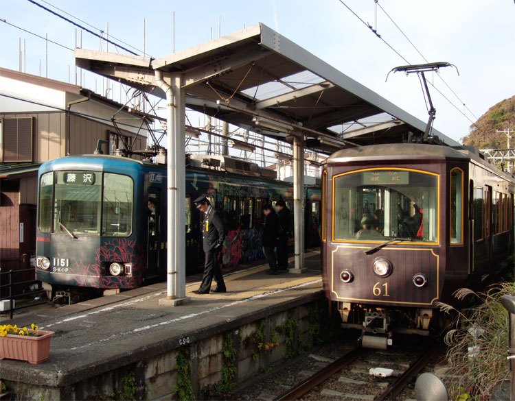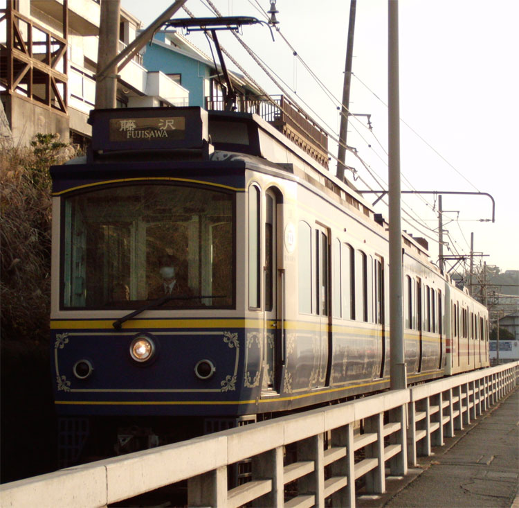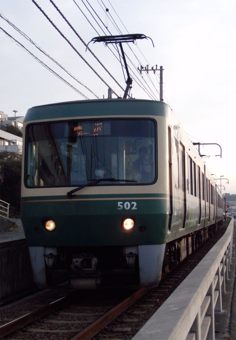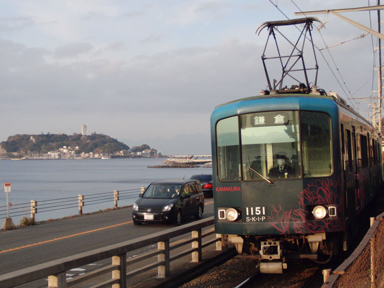 江ノ電沿線をポタリング。腰越駅から2003編成+1500形が発車。 江ノ島〜腰越間は併用軌道区間、「嵐電号」の1502編成がやってきました。 腰越駅から少しだけ江ノ電と離れ、とりあえず海岸沿いの道へ。といっても、すぐに江ノ電が合流してきます。腰越〜鎌倉高校前を走行中に、502編成とすれ違い。 鎌倉高校前駅を少し過ぎた所は、海バックで江ノ電が撮影できる有名な撮影地。S・K・I・P号の1101編成が通過。いつかはここで305編成も撮りたいですねぇ。 ここから七里ヶ浜駅へ、10編成とすれ違い。 七里ヶ浜駅へは少し海から離れます。線路沿いには車1台通れるかどうか位の道がありますが、江ノ電との間に柵が無くすっきりとした写真が撮れる撮影地です。今回は撮影しませんでしたが。 七里ヶ浜を超えると、江ノ電は再び海岸沿いを走行。ただこの辺りは海をバックに撮ることはできません。 また海から離れて、稲村ヶ崎駅。ここでは交換があります。 この辺りまでくると、鎌倉の山が近いのでアップダウンが激しくなります。極楽寺駅へと向かう道は、江ノ電と離れたり近づいたり。坂道が続きます。極楽寺駅を通過。 こちらは、極楽寺〜長谷間にある開業当時から残る「極楽洞」。100周年のポスターにも使われていましたね。 長谷駅を通過して、ちょっと大仏に寄り道。 県道311号線を走って、鎌倉にゴール。最後の方は、早朝からの活動による疲れもあってフラフラでした・・・。初詣は、亀岡八幡宮で。 いつも何気なく車窓から眺める景色も、自転車のスピードだとじっくりと感じることができますね。今後も気になった路線に沿って走ってみようかな、と思いました。 この後は、町田市内の幼稚園に保存されている都電6159号車を訪問。続きます。 −おまけ− 町田にて。7004Fの「はこね」。