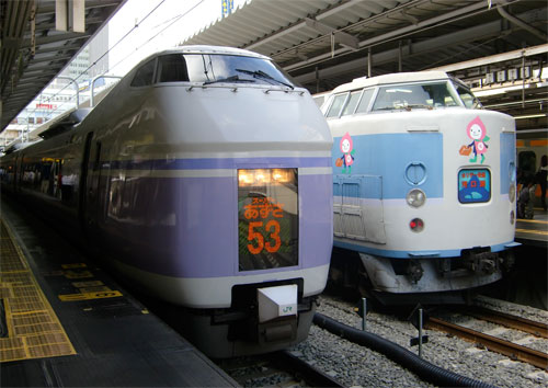 この日は、都内に行ってきました。まずは、「あずさ色」を身にまとう183系と189系の話題から。 新宿駅を6:30に発車する「あずさ71号」は、ごく最近まで幕張の183・189系C編成が使用されてきましたが、C編成引退のため、しばらくE257系での運転となっていました。この列車に、「あずさ色」の本家本元であるマリ32編成が使用されたので、豊田駅にて狙いました。 幕「特急」。「あずさ」絵幕は入っていないので仕方ないですが・・・。しかし183系マリ編成が「特急」を表示したのも久々な気がします。 すぐに、豊田車セから189系M50編成が出庫してきました。こちらも「あずさ色」を身にまとい、時折「かいじ」での使用もされていますが、絵幕は未装備だったと思います。 新宿にて、351系との並びも。 ボロボロのマリ32編成が「特急」、ピカピカのM50編成が「快速」に使用されるということで、この日限りは立場が逆転する形となりました。