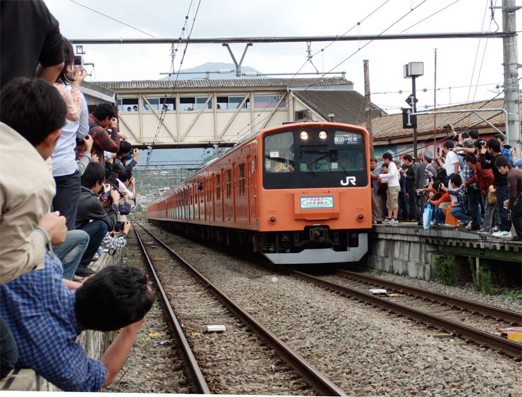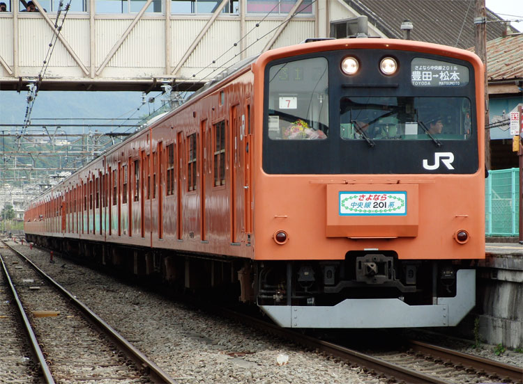 この日は、「H7編成ラストラン山梨 そして信州へ〜」を撮影してきました。出来れば、この日は来てほしくなかったのですが・・・・・・。 ホリデー快速河口湖3号(全検直後のH61編成でした)に乗車して、大月へ。H7編成を見送りました。最後のオレンジ一色塗り車両、最後のトタ区201系、帰らぬ旅へ・・・。入線してきました。種別方向幕はシール式の特製HMで、長野方が「さよなら中央線201系」東京方が「ありがとう中央線201系」。前面方向幕は「ありがとう中央線201系 豊田→松本 さよなら中央線201系 豊田→松本」でした。 停車中。停車時間もあったことから、たくさんのファンが集まりました。 粘って何とかこの一枚が撮れました。 定期運用区間を後にします。 ありがとう・・・。 本当に、本当にお疲れさまでした。この後、H7編成は無事に松本に到着し、その後回送で長野へ。最後の運転を終了しました。 PR