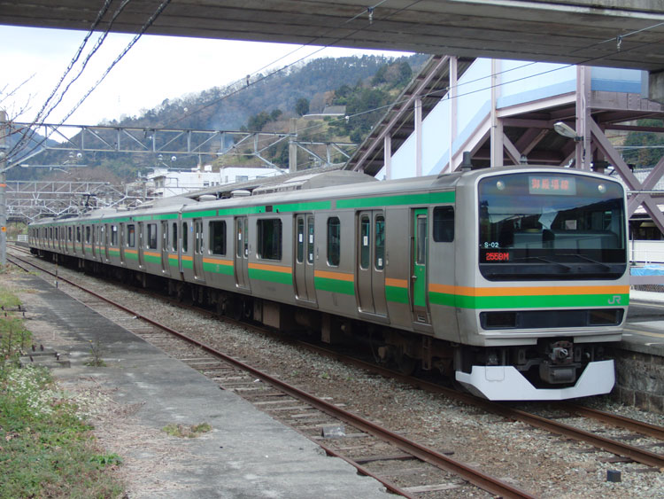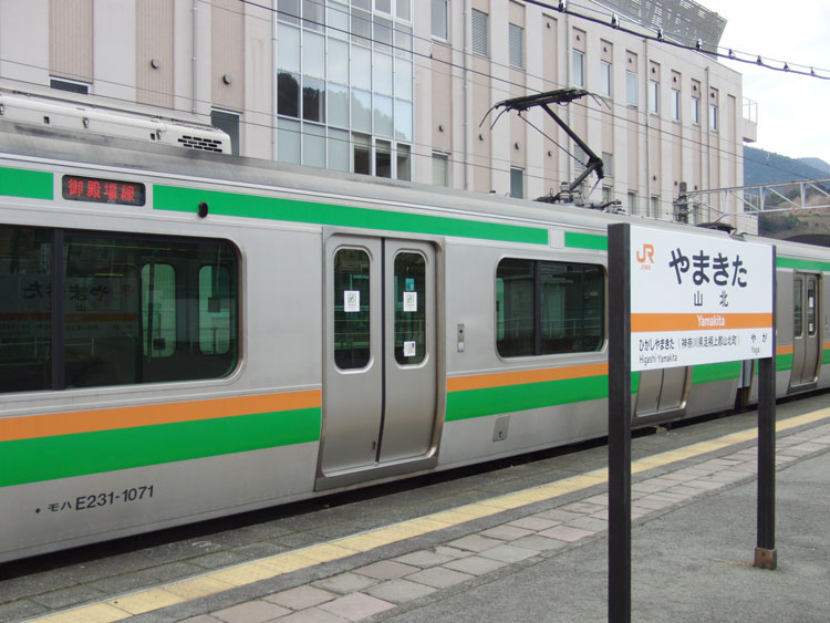 山北鉄道公園のD52を訪問した後は、駅に戻ります。 駅舎。瓦屋根の立派な駅舎です。駅前はシャッターだらけでしたが・・・。 さて・・・御殿場線には1日2往復(うち下り1本は東京から直通)のみ、E231系が走行しています。しかし3月のダイヤ改正によってこちらも運用が消滅。せっかくなので今回はこちらに乗車です。山北始発2558M。 JR東海の駅名標と合わせて。他に見られるのは沼津ぐらいでしょうか? 折り返し準備が整っていなかったのか表示は「山北」でした。 折り返しまでずっと停車しているんだからドアを開ければいいのに、発車10分前までドア扱い無しで、ホームで凍えながら待ってました。 乗り心地は・・・御殿場線はやはり線路状態が悪いのか、かなり揺れました。しかし加速が豪快で格好良かったですね。あと驚いたのは、御殿場線内では肉声放送で、扉閉め前にはしっかりと笛も鳴らしていたこと。ちょっと不満だったのは、ドアボタンが付いているにもかかわらず、全駅で全ドア開閉したこと・・・この日は太陽が出てなかったこともあり、寒い一日だったので・・・。 そんなこんなで、国府津に到着。回送列車となって国府津車両センターに引き上げます。 この後は、続いて入線してきた特別快速に乗って平塚へ。平塚市文化公園のD52 403号機を訪問。続きます。