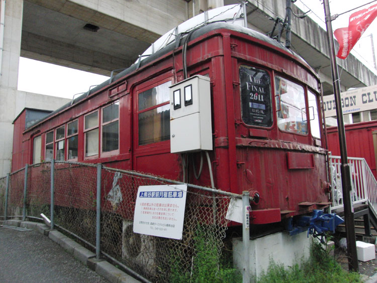 仙元山公園のD51 885号機の後は、上熊谷駅前のバーで使用されている秩父鉄道クハニ22を訪問。 ・車歴 不明。詳細が分かり次第追記します。 秩父鉄道クハニ20形の1両で、かなり前からここで飲食店等で使用されているようです。ド派手な真っ赤な塗装。 車体は2分割にされ、90度の角度で設置されています。いきなり豪雨が降ってきたので急いで退散っ(汗) −おまけ− 熊谷駅に留置中だった秩父鉄道の車両たち。 1002Fはこの時点で休車になっていたようで、5月19日の秩父鉄道わくわくフェスタ2012会場直通列車の運転を以て引退しています。国鉄・JR101系時代から長年の活躍、本当にお疲れさまでした。秩父鉄道の1000系リバイバルカラーもだいぶ減ってきました。 PR コメントを投稿する
