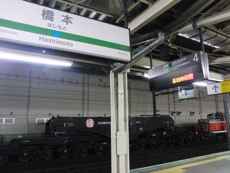 取卸しを終え後は帰るだけ。2日の夜にはシキ801の返却回送が行なわれました。 相模線の終電が遅れていた関係か?事前に発表されていた発車時刻を大幅に過ぎて相模線の留置線に入ってきた特大編成。帰りも八王子までDE10−1555が牽引。 ↑9891レ DE10-1555[新鶴]+シキ801+ヨ8404@橋本 思わぬ大仕事を任された1555号機。お疲れさまでした。 ↑同上 変圧器が積載されておらずともやはり迫力がある”シキ”。また横浜線に入線してくるのは果たしていつとなるのでしょうかね。その時を密かに待っていたいと思います。 ↑同上 しばらくするとDE10の前照灯が消され入れ換え灯のみに。これは入れ換えがあるか・・・と思いましたが、すでに発車時刻は過ぎているし、駐車場の時間がギリギリだったので、ここまで。 ↑同上 「橋本」の駅名票とも、ばっちり絡めておきましたよ。 ↑同上 本当に思わず濃密な1日となりましたが、貴重な体験が出来て本当に良かったなと。欲を言えば電気機関車牽引で入線してもらいたかったところですが、橋本周辺の保線の線路が一部非電化であるためか?普段から甲種輸送を牽引しているDE10が牽引となり、結果としては面白い編成になりました。 この日はこれにて帰宅。急いで改札を出場して駐車場へ。なんとか閉館時間に間に合ったのでした。 PR コメントを投稿する