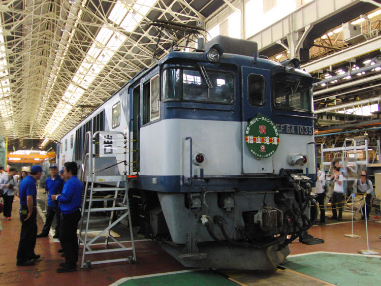 引き続き大宮総合車両センターふれあいフェア2013の模様です。 [JR貨物大宮車両所] 東新潟機関区のDE10 1539、新鶴見機関区のDE10 1586がそれぞれ入場中。1539号機には「あけぼの」ヘッドマーク。 ファンを驚かせたのが、こちらのEF64 1049。広島更新色を纏っていた元岡山機関区所属の3機のうち、1047号機は大宮更新色となって出場しており、残りの2機も大宮更新色に変更されるものと思われていましたが、1049号機と1046号機は若干色は異なるものの広島更新色で出場してきました。 その他にはEH500-29、EF64 1035などが入場中でした。 外には今回展示車両がありませんでしたが、チラッとEF65 2097。 [その他] いつもの高架下に新しく「検修技能訓練所」が設置され、ケヨ24編成の先頭車であり、205系のトップナンバー、クハ205-1が利用されています。保存も兼ねているのでしょう。いつかてっぱくの拡張が行われるでしょうから、その際にはてっぱく入りかもしれませんね。 いつも通りクモハ300-4も。こちらも拡張されれば…という感じでしょうか。 大宮総合車両センターを出て、入口付近のD51 187号機。今年は時刻表50thのヘッドマークが掲出されました。 大正橋へ。DE11 1034には「はくつる」、DE10 1099には「あけぼの」ヘッドマークでした。 大正橋を渡っていると…東武野田線の大宮駅で聞き慣れない接近放送が。続きます。 PR コメントを投稿する