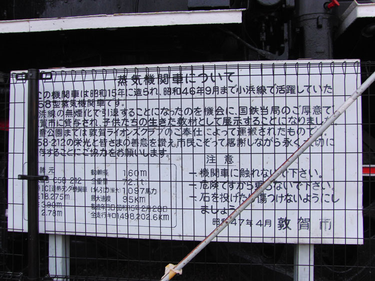 米原から521系に乗って敦賀に到着。敦賀駅から徒歩約5分の本町第3公園のC58 212号機を訪問。 ・車歴 製造年月日 1940年2月28日 製造所 川崎車輛 1940年2月28日 梅小路機関区 1940年8月 紀伊田辺機関区 1948年6月 奈良機関区 1962年8月4日 八王子機関区 1969年10月13日 横浜線蒸気機関車さよなら列車(貨物)を牽引 1969年10月24日 高崎第一機関区 1970年7月30日 七尾機関区 1971年頃 敦賀第一機関区 1971年10月20日 敦賀第一機関区にて廃車 案内板はこちら。 車歴にもあるとおり、昭和44年・横浜線無縁化の際のさよなら列車(貨物列車)を八王子〜小机間で牽引した機関車です。1962年から1969年まで八王子機関区に配置されており、横浜線で貨物列車を牽引したC58の中で唯一の保存機。 積雪のある地域ということで頑丈な上屋が設置されており、状態は良好ですが、デフには投石の跡も。以前は格子状の柵が取り付けられていなかったようです。八王子機関区に所属していた頃は副灯が付いていたようですが、保存時に取り外されたのか現在の同機には取り付けられていません。 非公式側の側面プレートはありませんでした。製造銘板は真っ黒。動輪は塗装されています。 公式側、側面プレート周り。こちらには側面プレートも残っており、製造銘板も黒塗装されていません。 後ろから。後部灯のガラスが無くなっています。 住宅地の中にあり、あまり人目がある場所ではありませんが、荒廃することはなさそうです。横浜線を走ったSLの貴重な生き残り、今後も大切に保存されることを願います。 この後は、敦賀駅に戻って福井に移動。福井鉄道福武線を撮影します。続く。 PR コメントを投稿する