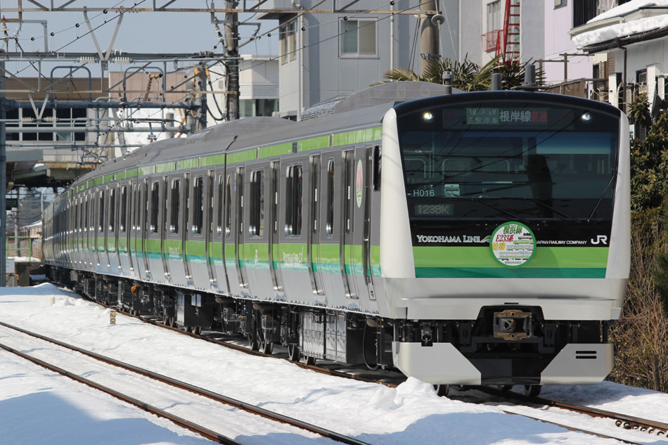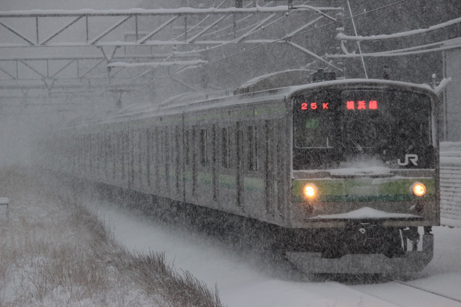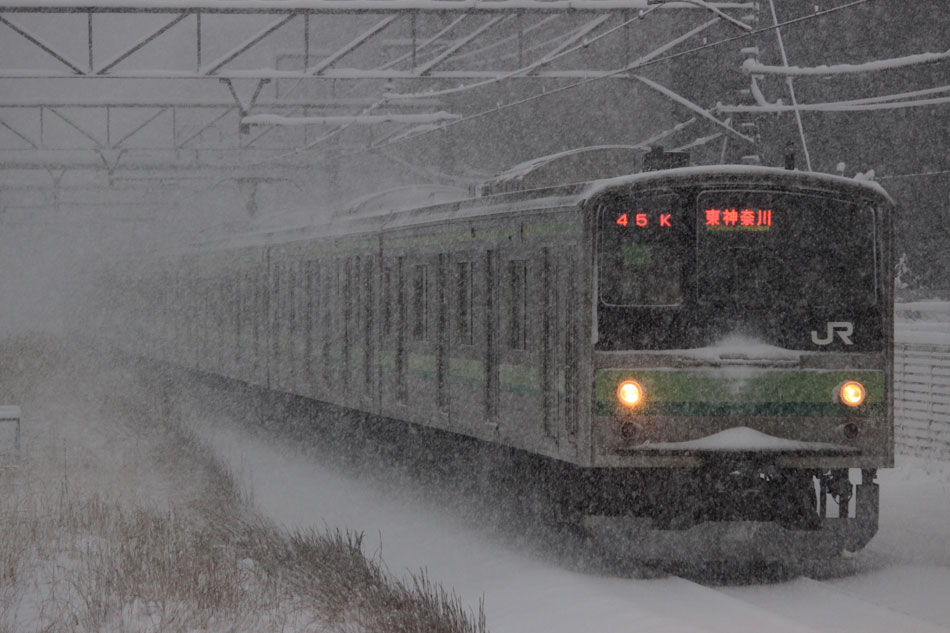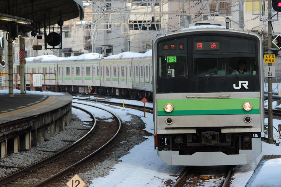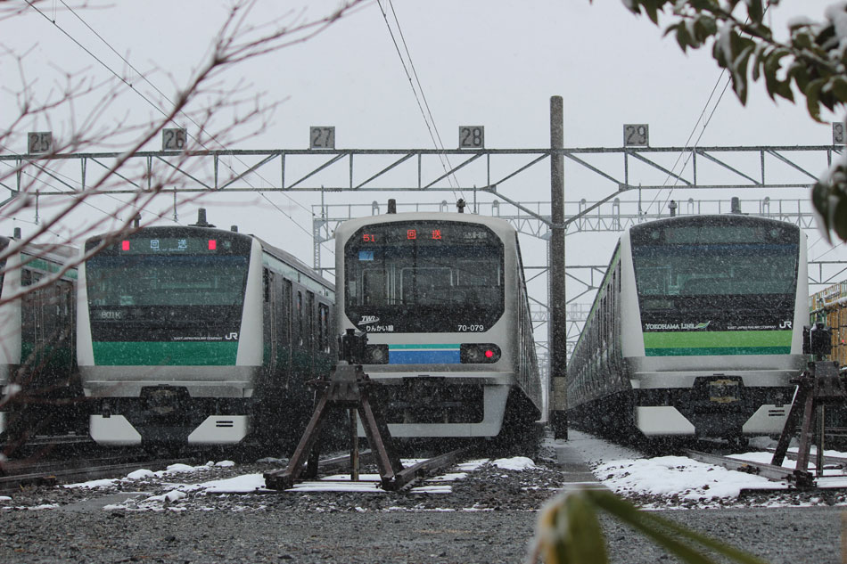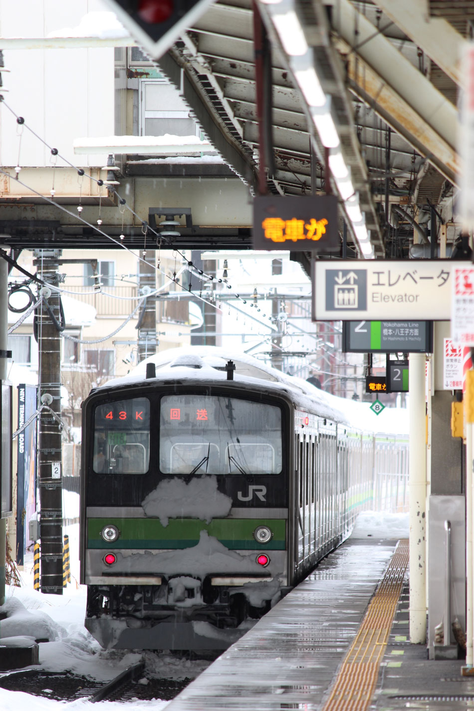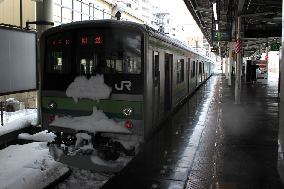 2月中旬の横浜線撮影分です。 ・11日 町田以北では8日に降った雪が融けずに残っていました。836KはH12編成が充当。 ↑836K 205系H12編成8B 快速"大船行"@相模原 橋本に移動、相原まで積雪状況を確認しつつ徒歩で雪×横浜線を何枚か。撮影中には雪がちらつく場面も。 ↑931K 205系H15編成8B 各停"八王子行"@橋本〜相原間 ↑951K 205系H14編成 各停"八王子行"@同上 ↑1050K 205系H14編成8B 快速"桜木町行"@相原〜橋本間 午後は川越車両センターに疎開したH002編成を見に行ったところ、数時間前に東大宮に移動したとのことで、東大宮で185系に囲まれるH002編成を撮影。翌日の高崎疎開を控えたハエ22編成に場所を開ける目的だったようで、翌12日にハエ22編成の高崎疎開後、東大宮から川越に戻っています。東大宮疎開はこの時だけ見られたシーン。 ・12日 H003編成の配給が新津〜大船間(武蔵野線経由)で運転されました。 ↑配9774レ EF64 1030[長岡]+E233系H003編成8B 配給@新座 ↑同上(後追い) ・13日 この日もH017編成の回送が運転されました。 ↑回9554K E233系H017編成8B 回送@相模原 ・14日 朝から雪が降っていましたが、まずは11日に見られなかったH002編成川越疎開。輸送障害による運用変更によりりんかい線70-000系が入庫しており、イレギュラーな並びが実現。 埼京線に入ってヘッドマーク付きのハエ28編成を撮影した後、帰りがけに淵野辺に寄り道。 ↑1644K 205系H20編成8B 各停"東神奈川行"@淵野辺 ↑1650K 205系H15編成8B 各停"東神奈川行"@同上 ↑1624K 205系H8編成8B 各停"桜木町行"@同上 ↑1640K 205系H21編成8B 各停"東神奈川行"@同上 この後雪が激しくなり、各所で倒竹や車両故障が発生、最終的に架線が切れて横浜線は終日運転見合わせ。暖房が効かない車内で一夜を過ごした人もいたようです。この日運転されていたH017編成の乗務員訓練に伴う回送列車は、橋本を出庫出来ずそのまま留置された模様。 ・15日 前日からの大雪により、始発から横浜線は再開見込みが立たず。 淵野辺駅では下り列車として発車直後のH18編成が立ち往生。 ↑22**K 205系H18編成8B@淵野辺付近 車内に乗客がいたのでどうしたんだろうと駅に向かうとこの掲示。 改札は自由入場だったのでホームへ。この時点では"43K 回送"表示で停車中、ドアは階段至近の1箇所のみドアコック扱いで開かれていました。車内の様子も見てみましたが、災害用毛布等が配布されたようで、この車内で一晩過ごしたと思われる人も多く見受けられました。 ↑205系H18編成8B@淵野辺 接近が点いていたので古淵方を見るとこちらにも立ち往生した列車。というわけで改札を抜けて現場へ、2235Kとして八王子へ向かっていたと思われるH7編成でした。こちらは車内に乗客はおらず乗務員のみ。 ↑205系H7編成8B@古淵〜淵野辺間 道路上の雪は除雪されておらず、ここまで来るのも大変だったのでこれ以上は進まず一度帰宅。9:40頃から東神奈川〜小机間で折り返し運転を開始するも小机〜八王子間はまだ見込みが立たず、12:30頃約13時間ぶりに全線での運転再開となりました。 淵野辺で抑止されていたH18編成の運転再開を確認し(後退せずに発車)、再出撃。まずはH7編成が通過。 ↑2235K(+820min) 205系H7編成8B 各停"八王子行" 町田まで下り線の除雪をしてきたらしいH21編成は回送で通過。 ↑回9*21K 205系H21編成8B 臨時回送 ↑**11K 205系H8編成8B 各停"八王子行" しばらく下り列車の間隔が開くという放送を聞いて少し移動。今度は上り線の除雪臨時回送、H24編成が通過。雪の塊を無理に除雪したためか前面排障器が折れ曲がっています。 ↑回9*40K? 205系H24編成8B 臨時回送 八王子からの上り線はH24編成しか在線が無かったようで、下り線の運転再開第一便だったH18編成が八王子から折り返して上り再開第一便となりました。 ↑1222K(+68min) 205系H18編成8B 各停"東神奈川行" 橋本派出の除雪が完了するまで横浜線は少ない本数で運行されていましたが、除雪完了後順次橋本から出庫し、夜までには平常運転に。しかし21:30頃八王子みなみ野〜片倉間で倒木が発生したため、再び運転見合わせ・遅れが生じました。 なお、H017編成は21時過ぎに橋本を出庫し大船に回送されました。翌日の運用開始に備え、2日にH002編成が付けていたヘッドマークを掲出したH001編成が大船〜東神奈川間で回送、こちらもヘッドマークを掲出したH016編成が大船〜橋本間で回送されています。 ・16日 横浜線E233系がいよいよデビュー。東神奈川駅で予定されていた出発式は、前日までの大雪の影響で中止されましたが、沿線には今まで見たことがない程たくさんのファンが詰めかけていました。 新型車両運用開始日にもかかわらず、横浜線は朝の橋本駅ポイント不転換の影響で遅延が発生。836KはH9編成が充当。 ↑836K 205系H9編成8B 快速"大船行"@淵野辺 遅延の影響も心配されたものの、H001編成は東神奈川〜小机間で臨時回送後、H13編成から運用変更し予定通り1003Kで無事に運用開始! ↑1003K E233系H001編成8B(HM掲出) 各停"橋本行"@菊名 こちらのH001編成に初乗車、前日に橋本まで回送されていたH016