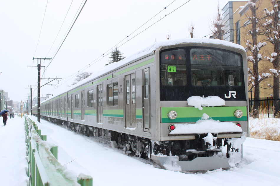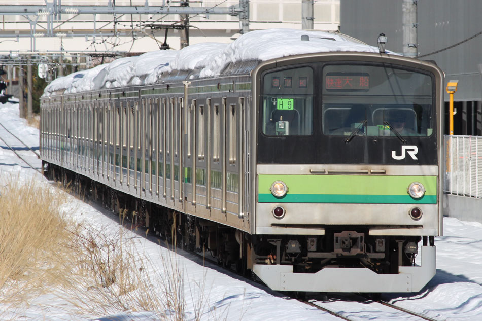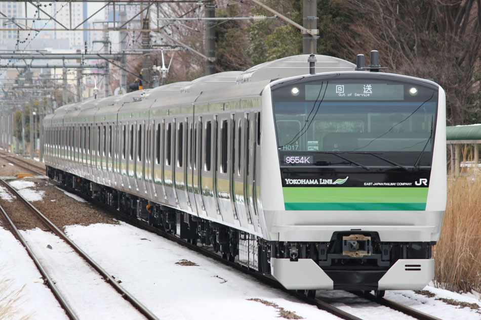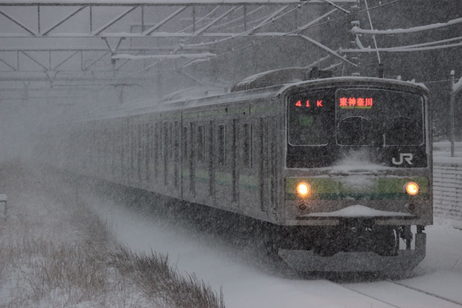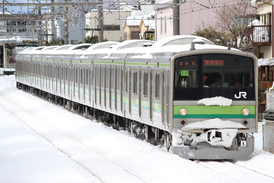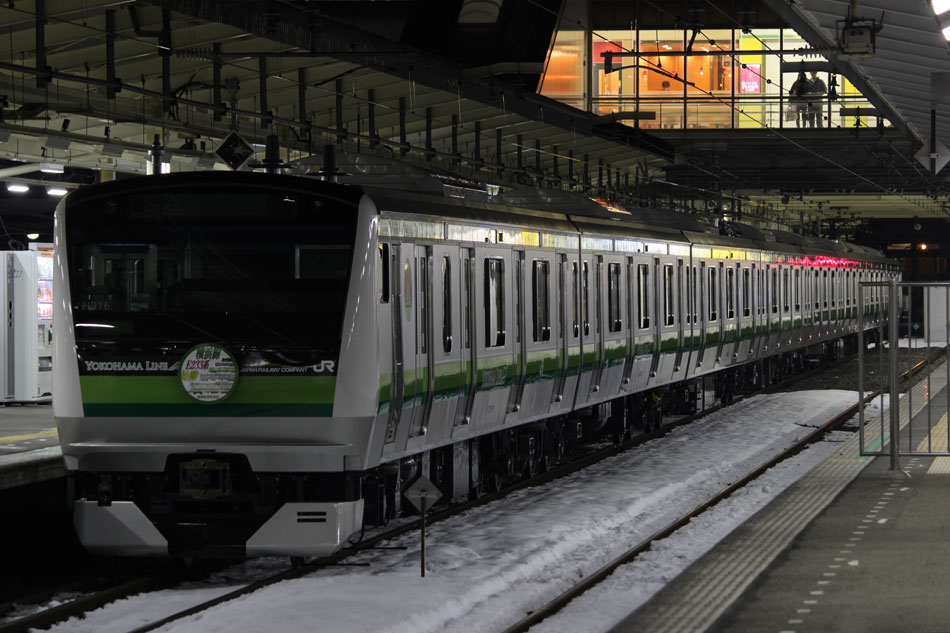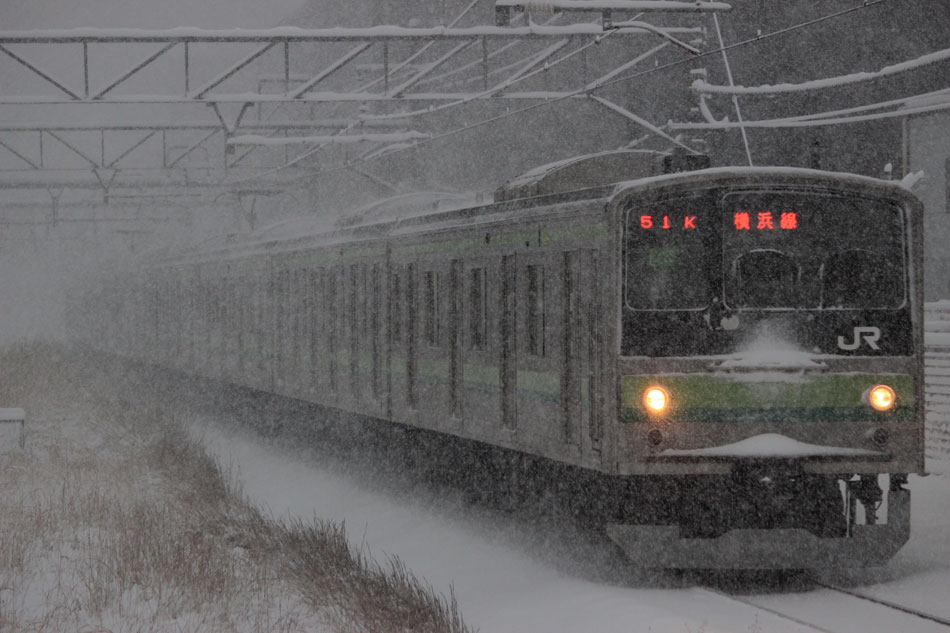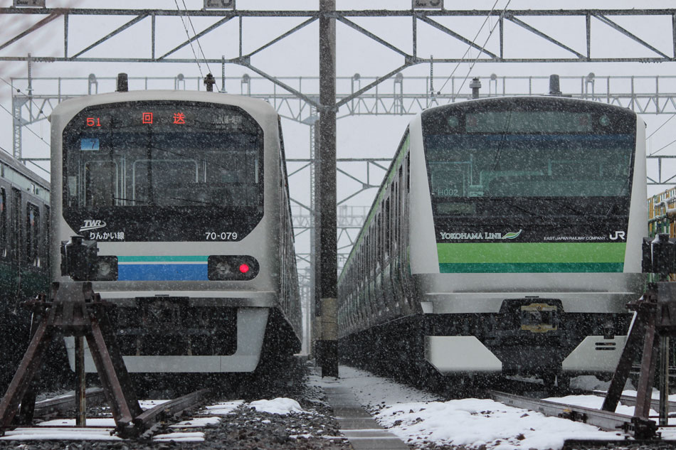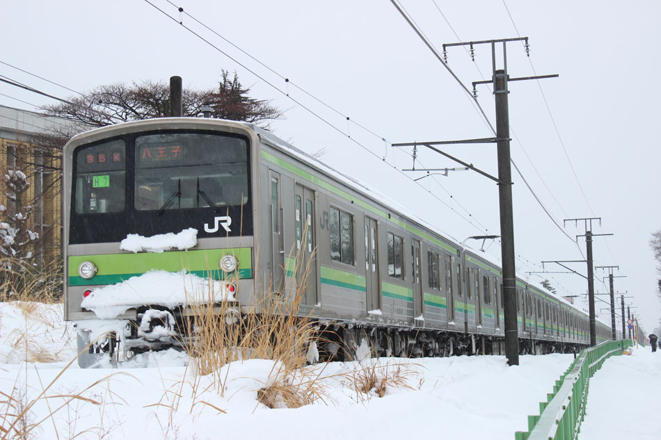 2月中旬の横浜線撮影分です。 ・11日 町田以北では8日に降った雪が融けずに残っていました。836KはH12編成が充当。 ↑836K 205系H12編成8B 快速"大船行"@相模原 橋本に移動、相原まで積雪状況を確認しつつ徒歩で雪×横浜線を何枚か。撮影中には雪がちらつく場面も。 ↑931K 205系H15編成8B 各停"八王子行"@橋本〜相原間 ↑951K 205系H14編成 各停"八王子行"@同上 ↑1050K 205系H14編成8B 快速"桜木町行"@相原〜橋本間 午後は川越車両センターに疎開したH002編成を見に行ったところ、数時間前に東大宮に移動したとのことで、東大宮で185系に囲まれるH002編成を撮影。翌日の高崎疎開を控えたハエ22編成に場所を開ける目的だったようで、翌12日にハエ22編成の高崎疎開後、東大宮から川越に戻っています。東大宮疎開はこの時だけ見られたシーン。 ・12日 H003編成の配給が新津〜大船間(武蔵野線経由)で運転されました。 ↑配9774レ EF64 1030[長岡]+E233系H003編成8B 配給@新座 ↑同上(後追い) ・13日 この日もH017編成の回送が運転されました。 ↑回9554K E233系H017編成8B 回送@相模原 ・14日 朝から雪が降っていましたが、まずは11日に見られなかったH002編成川越疎開。輸送障害による運用変更によりりんかい線70-000系が入庫しており、イレギュラーな並びが実現。 埼京線に入ってヘッドマーク付きのハエ28編成を撮影した後、帰りがけに淵野辺に寄り道。 ↑1644K 205系H20編成8B 各停"東神奈川行"@淵野辺 ↑1650K 205系H15編成8B 各停"東神奈川行"@同上 ↑1624K 205系H8編成8B 各停"桜木町行"@同上 ↑1640K 205系H21編成8B 各停"東神奈川行"@同上 この後雪が激しくなり、各所で倒竹や車両故障が発生、最終的に架線が切れて横浜線は終日運転見合わせ。暖房が効かない車内で一夜を過ごした人もいたようです。この日運転されていたH017編成の乗務員訓練に伴う回送列車は、橋本を出庫出来ずそのまま留置された模様。 ・15日 前日からの大雪により、始発から横浜線は再開見込みが立たず。 淵野辺駅では下り列車として発車直後のH18編成が立ち往生。 ↑22**K 205系H18編成8B@淵野辺付近 車内に乗客がいたのでどうしたんだろうと駅に向かうとこの掲示。 改札は自由入場だったのでホームへ。この時点では"43K 回送"表示で停車中、ドアは階段至近の1箇所のみドアコック扱いで開かれていました。車内の様子も見てみましたが、災害用毛布等が配布されたようで、この車内で一晩過ごしたと思われる人も多く見受けられました。 ↑205系H18編成8B@淵野辺 接近が点いていたので古淵方を見るとこちらにも立ち往生した列車。というわけで改札を抜けて現場へ、2235Kとして八王子へ向かっていたと思われるH7編成でした。こちらは車内に乗客はおらず乗務員のみ。 ↑205系H7編成8B@古淵〜淵野辺間 道路上の雪は除雪されておらず、ここまで来るのも大変だったのでこれ以上は進まず一度帰宅。9:40頃から東神奈川〜小机間で折り返し運転を開始するも小机〜八王子間はまだ見込みが立たず、12:30頃約13時間ぶりに全線での運転再開となりました。 淵野辺で抑止されていたH18編成の運転再開を確認し(後退せずに発車)、再出撃。まずはH7編成が通過。 ↑2235K(+820min) 205系H7編成8B 各停"八王子行" 町田まで下り線の除雪をしてきたらしいH21編成は回送で通過。 ↑回9*21K 205系H21編成8B 臨時回送 ↑**11K 205系H8編成8B 各停"八王子行" しばらく下り列車の間隔が開くという放送を聞いて少し移動。今度は上り線の除雪臨時回送、H24編成が通過。雪の塊を無理に除雪したためか前面排障器が折れ曲がっています。 ↑回9*40K? 205系H24編成8B 臨時回送 八王子からの上り線はH24編成しか在線が無かったようで、下り線の運転再開第一便だったH18編成が八王子から折り返して上り再開第一便となりました。 ↑1222K(+68min) 205系H18編成8B 各停"東神奈川行" 橋本派出の除雪が完了するまで横浜線は少ない本数で運行されていましたが、除雪完了後順次橋本から出庫し、夜までには平常運転に。しかし21:30頃八王子みなみ野〜片倉間で倒木が発生したため、再び運転見合わせ・遅れが生じました。 なお、H017編成は21時過ぎに橋本を出庫し大船に回送されました。翌日の運用開始に備え、2日にH002編成が付けていたヘッドマークを掲出したH001編成が大船〜東神奈川間で回送、こちらもヘッドマークを掲出したH016編成が大船〜橋本間で回送されています。 ・16日 横浜線E233系がいよいよデビュー。東神奈川駅で予定されていた出発式は、前日までの大雪の影響で中止されましたが、沿線には今まで見たことがない程たくさんのファンが詰めかけていました。 新型車両運用開始日にもかかわらず、横浜線は朝の橋本駅ポイント不転換の影響で遅延が発生。836KはH9編成が充当。 ↑836K 205系H9編成8B 快速"大船行"@淵野辺 遅延の影響も心配されたものの、H001編成は東神奈川〜小机間で臨時回送後、H13編成から運用変更し予定通り1003Kで無事に運用開始! ↑1003K E233系H001編成8B(HM掲出) 各停"橋本行"@菊名 こちらのH001編成に初乗車、前日に橋本まで回送されていたH016