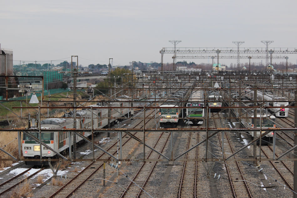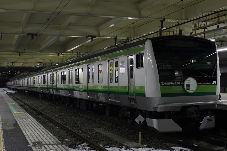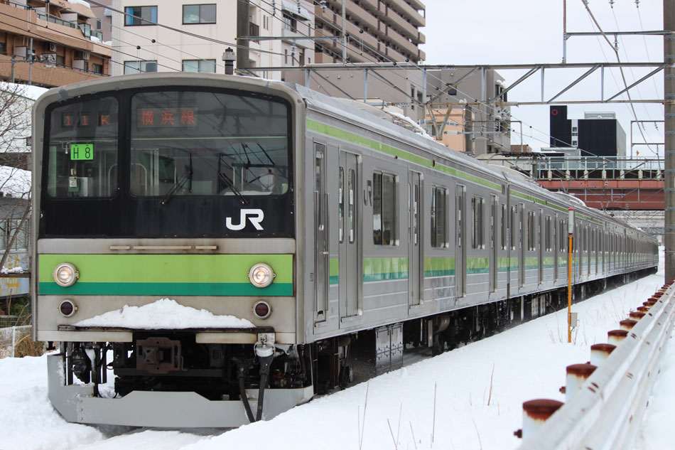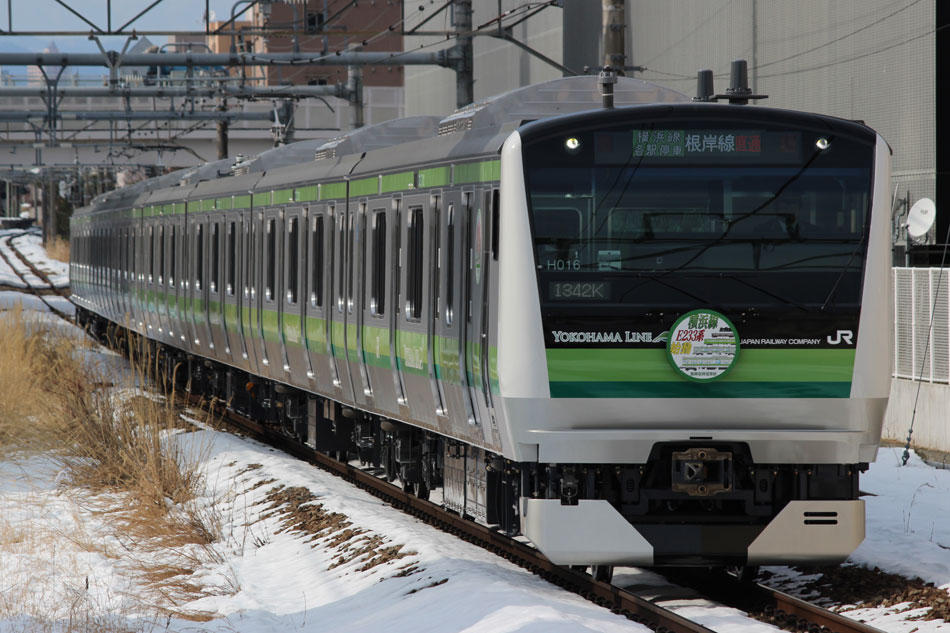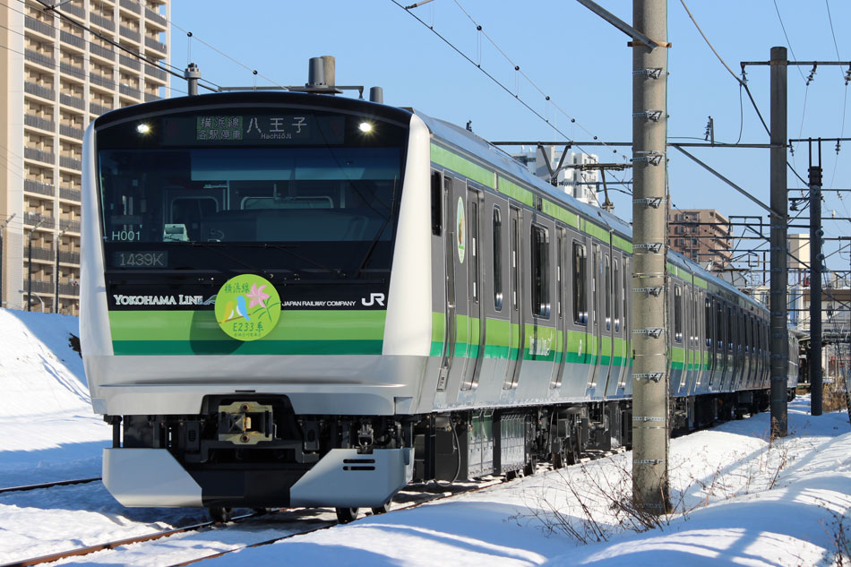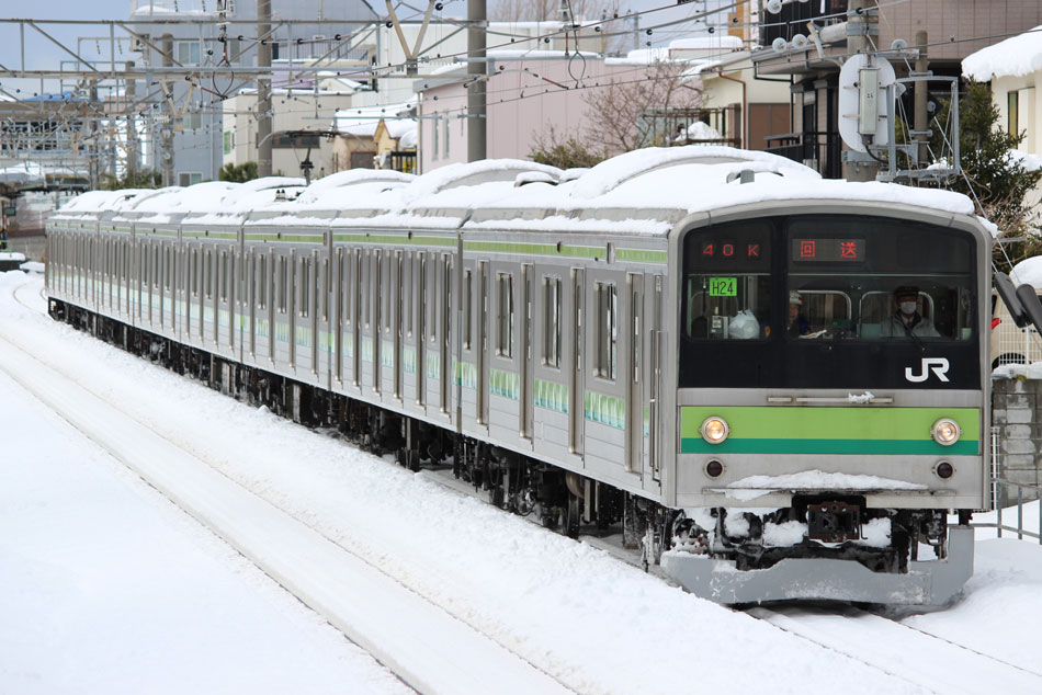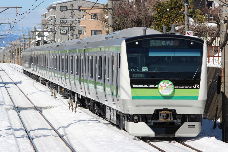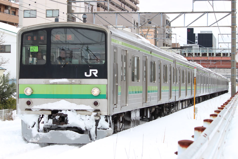 2月中旬の横浜線撮影分です。 ・11日 町田以北では8日に降った雪が融けずに残っていました。836KはH12編成が充当。 ↑836K 205系H12編成8B 快速"大船行"@相模原 橋本に移動、相原まで積雪状況を確認しつつ徒歩で雪×横浜線を何枚か。撮影中には雪がちらつく場面も。 ↑931K 205系H15編成8B 各停"八王子行"@橋本〜相原間 ↑951K 205系H14編成 各停"八王子行"@同上 ↑1050K 205系H14編成8B 快速"桜木町行"@相原〜橋本間 午後は川越車両センターに疎開したH002編成を見に行ったところ、数時間前に東大宮に移動したとのことで、東大宮で185系に囲まれるH002編成を撮影。翌日の高崎疎開を控えたハエ22編成に場所を開ける目的だったようで、翌12日にハエ22編成の高崎疎開後、東大宮から川越に戻っています。東大宮疎開はこの時だけ見られたシーン。 ・12日 H003編成の配給が新津〜大船間(武蔵野線経由)で運転されました。 ↑配9774レ EF64 1030[長岡]+E233系H003編成8B 配給@新座 ↑同上(後追い) ・13日 この日もH017編成の回送が運転されました。 ↑回9554K E233系H017編成8B 回送@相模原 ・14日 朝から雪が降っていましたが、まずは11日に見られなかったH002編成川越疎開。輸送障害による運用変更によりりんかい線70-000系が入庫しており、イレギュラーな並びが実現。 埼京線に入ってヘッドマーク付きのハエ28編成を撮影した後、帰りがけに淵野辺に寄り道。 ↑1644K 205系H20編成8B 各停"東神奈川行"@淵野辺 ↑1650K 205系H15編成8B 各停"東神奈川行"@同上 ↑1624K 205系H8編成8B 各停"桜木町行"@同上 ↑1640K 205系H21編成8B 各停"東神奈川行"@同上 この後雪が激しくなり、各所で倒竹や車両故障が発生、最終的に架線が切れて横浜線は終日運転見合わせ。暖房が効かない車内で一夜を過ごした人もいたようです。この日運転されていたH017編成の乗務員訓練に伴う回送列車は、橋本を出庫出来ずそのまま留置された模様。 ・15日 前日からの大雪により、始発から横浜線は再開見込みが立たず。 淵野辺駅では下り列車として発車直後のH18編成が立ち往生。 ↑22**K 205系H18編成8B@淵野辺付近 車内に乗客がいたのでどうしたんだろうと駅に向かうとこの掲示。 改札は自由入場だったのでホームへ。この時点では"43K 回送"表示で停車中、ドアは階段至近の1箇所のみドアコック扱いで開かれていました。車内の様子も見てみましたが、災害用毛布等が配布されたようで、この車内で一晩過ごしたと思われる人も多く見受けられました。 ↑205系H18編成8B@淵野辺 接近が点いていたので古淵方を見るとこちらにも立ち往生した列車。というわけで改札を抜けて現場へ、2235Kとして八王子へ向かっていたと思われるH7編成でした。こちらは車内に乗客はおらず乗務員のみ。 ↑205系H7編成8B@古淵〜淵野辺間 道路上の雪は除雪されておらず、ここまで来るのも大変だったのでこれ以上は進まず一度帰宅。9:40頃から東神奈川〜小机間で折り返し運転を開始するも小机〜八王子間はまだ見込みが立たず、12:30頃約13時間ぶりに全線での運転再開となりました。 淵野辺で抑止されていたH18編成の運転再開を確認し(後退せずに発車)、再出撃。まずはH7編成が通過。 ↑2235K(+820min) 205系H7編成8B 各停"八王子行" 町田まで下り線の除雪をしてきたらしいH21編成は回送で通過。 ↑回9*21K 205系H21編成8B 臨時回送 ↑**11K 205系H8編成8B 各停"八王子行" しばらく下り列車の間隔が開くという放送を聞いて少し移動。今度は上り線の除雪臨時回送、H24編成が通過。雪の塊を無理に除雪したためか前面排障器が折れ曲がっています。 ↑回9*40K? 205系H24編成8B 臨時回送 八王子からの上り線はH24編成しか在線が無かったようで、下り線の運転再開第一便だったH18編成が八王子から折り返して上り再開第一便となりました。 ↑1222K(+68min) 205系H18編成8B 各停"東神奈川行" 橋本派出の除雪が完了するまで横浜線は少ない本数で運行されていましたが、除雪完了後順次橋本から出庫し、夜までには平常運転に。しかし21:30頃八王子みなみ野〜片倉間で倒木が発生したため、再び運転見合わせ・遅れが生じました。 なお、H017編成は21時過ぎに橋本を出庫し大船に回送されました。翌日の運用開始に備え、2日にH002編成が付けていたヘッドマークを掲出したH001編成が大船〜東神奈川間で回送、こちらもヘッドマークを掲出したH016編成が大船〜橋本間で回送されています。 ・16日 横浜線E233系がいよいよデビュー。東神奈川駅で予定されていた出発式は、前日までの大雪の影響で中止されましたが、沿線には今まで見たことがない程たくさんのファンが詰めかけていました。 新型車両運用開始日にもかかわらず、横浜線は朝の橋本駅ポイント不転換の影響で遅延が発生。836KはH9編成が充当。 ↑836K 205系H9編成8B 快速"大船行"@淵野辺 遅延の影響も心配されたものの、H001編成は東神奈川〜小机間で臨時回送後、H13編成から運用変更し予定通り1003Kで無事に運用開始! ↑1003K E233系H001編成8B(HM掲出) 各停"橋本行"@菊名 こちらのH001編成に初乗車、前日に橋本まで回送されていたH016