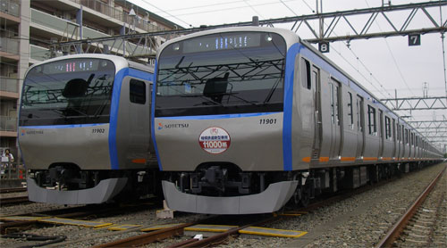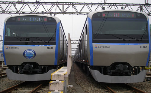 今日は、相鉄線の相模大塚駅構内留置線にて、明日15日デビューとなる新車、11000系の展示会が行われました。この模様を、祖母に撮影してもらいました。 11001編成と11002編成が並んで展示されました。海老名側。 続いて、横浜側。 さて、11002編成は、車内が公開されたようです。 最後にもう一度、海老名側。 昨年10月の甲種回送後、試運転が念入りに行われていよいよデビューする11000系。 2010年のJR乗り入れを考慮して、E233系ベースの車両となりました。今後増備されるのでしょうか。 デビューの15日から21日まで、11001編成はデビュー記念ヘッドマークを装着して運転されるようです。こちらも撮影してみてはいかがでしょうか。 PR コメントを投稿する