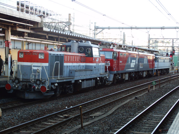 この日は、「ゲレンデ蔵王」送り込みを撮影してきました。その前に、大宮工場を覗いてみました。 DE10−1099が武蔵野線205系を牽引して入れ替え中。 EH500−28とDE10−1592の大宮工場出場に遭遇しました。牽引はEF65−1055。 出場する車両を見てみましょう。仙台総合鉄道部所属のEH500−28。 塩尻機関区所属?と思われるDE10−1592。 そうこうしているうちにEF65−1055が連結されました。 「ゲレンデ蔵王」送り込みを蓮田で撮影した(次回ご紹介予定)後、大宮駅に戻ってくると11番線に出場車両が停車中でした。 この他にも大宮工場の入れ替えを撮影しましたが、別の記事で。 PR コメントを投稿する