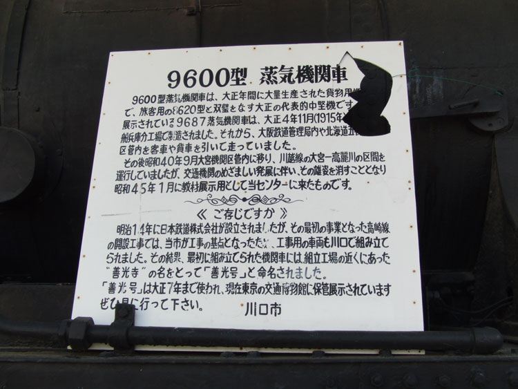 せせらぎ公園に行った後は、川口へ。青木町公園に保存されている、9687とデハ236を見学してきました。 まずは9687から。 製造年月日 1915年12月 製造所 川崎造船兵庫分工場 1929年 高崎 1947年 五稜郭 1969年11月6日 大宮で廃車 9600型蒸気機関車は、大正年間に大量生産された貨物用機関車で、旅客用の8620型と双璧をなす大正の代表的中堅機です。 展示されている9687蒸気機関車は、大正4年11月(1915年)に川崎造船兵庫分工場で製造されました。それから、大阪鉄道管理局内や北海道五稜郭機関区管内を客車や貨車を引いて走っていました。 その後昭和40年9月大宮機関区管内に移り、川越線の大宮−高麗川間の区間を運行していましたが、交通機関のめざましい発展に伴い、その勇姿を消すこととなり昭和45年1月に教材展示用として当センターに来たものです。 (案内板より) 柵が設置されているためとても撮りにくいです。 三脚にカメラを固定して、セルフタイマーで撮ったもの。 案内板。 続いてデハ236。 製造 1929年 この車両は、昭和5年(1930年)4月に、湘南電鉄デ1形として開業時に登場し(後にデハ230形と改称)、以来48年間活躍していましたが、昭和53年全車廃車されました。 当時の最高の技術を取り入れ、誕生以来関東の名車として広く知られており、現在の高速化のスタイルを確立した電車の草分け的存在でもあります。長い間に何回か改造が行われ、最終的にこのスタイルになったものです。 昭和54年4月、市民からの強い要望と京浜急行電鉄のご協力により、教育用として設置、展示されたものです。みんなで大切にしましょう。 川口市 工学博士 吉川昭吉郎 記 (案内板より) 結構荒廃しています・・・。 道路側から後ろ。 この後は、大荒田交通公園に保存されているC11に向かいます。 ※2011年10月 隣接する施設の閉館に伴い、解体撤去の話が出ているようです。 ※9687号機は2013年に整備されました。京急デハ236は2016年9月頃に京急へ里帰りすることが決定しました。 PR コメントを投稿する