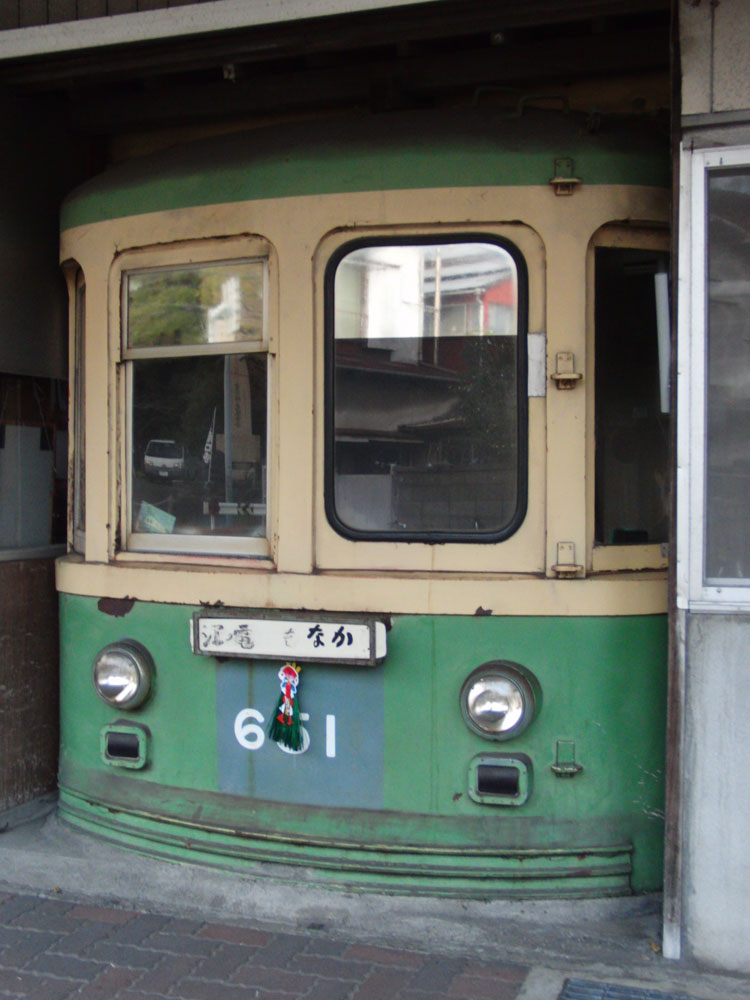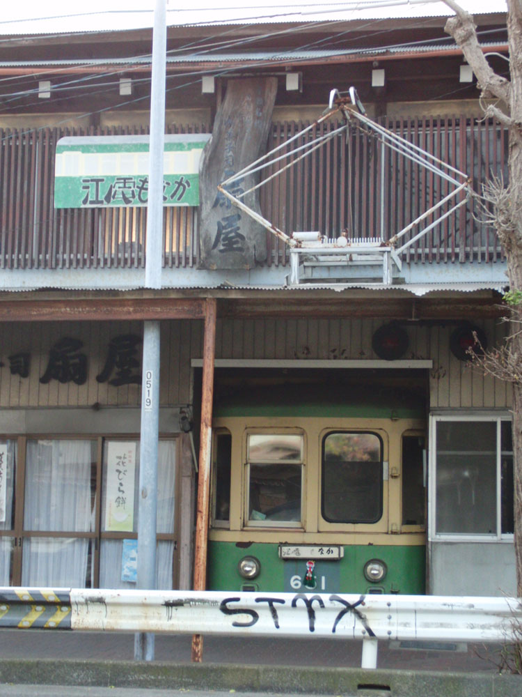 江ノ島からは、江ノ電沿線をポタリングしてみます。まずは、海岸沿いの通りから坂道を上った所にある「江ノ電もなか」で有名な扇屋さんの店頭にある、江ノ電651号車の前頭部。 ・車歴 1970年 玉電廃止に伴い江ノ電に譲渡 1990年 廃車 東急玉川線(玉電)は、1970年まで二子玉川園〜渋谷間を結んでいた路面電車です。廃車後に江ノ電に引き取られ、601号車+651号車の編成で運用に就きましたが、1990年に廃車となりました。601号車は、里帰りして宮の坂駅に保存されています。 一方、こちらの651号車は、江ノ電沿線の扇屋さんで前頭部のみが保存されました。 利用されていることもあり、状態は良好でした。今後も看板として愛されてほしいものです。 最寄り駅:江ノ島駅 徒歩1分弱 この後は、江ノ電沿線ポタを開始。続きます。 PR コメントを投稿する
